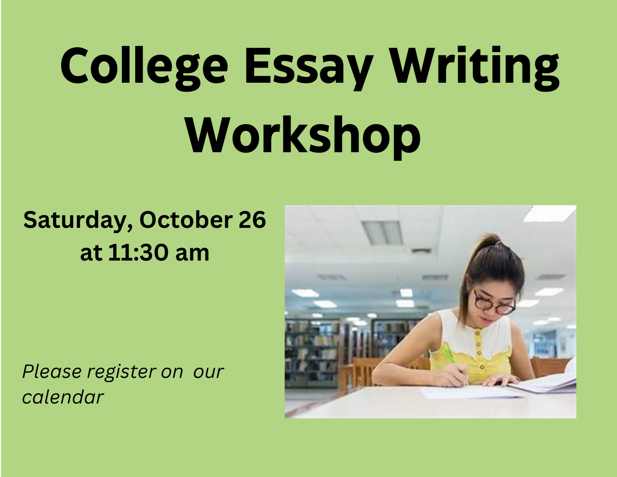 College Essay Writing Workshop Saturday, October 26 at 11:30 am If you need space and time to start your essay, here it is! Jessica McCabe will go over reading college essay prompts and brainstorming and drafting your essay. PLEASE BRING A LAPTOP OR TABLET TO DRAFT YOUR ESSAY. Jessica has a Bachelor's degree in English and Journalism and a master's degree in Student affairs counseling. With over a decade of higher education experience, she loves helping students on their way to and in their college experience.
