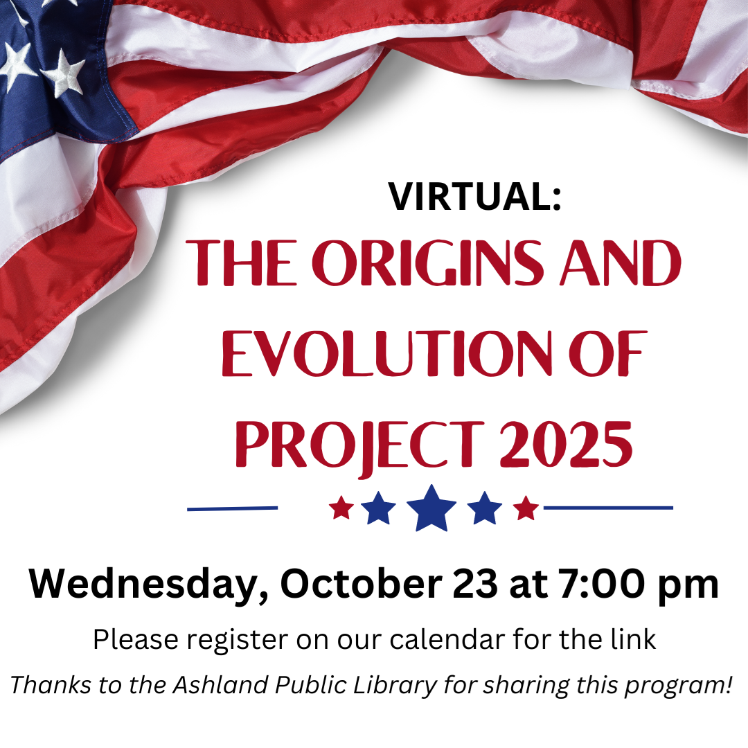 VIRTUAL: The Origins and Evolution of Project 2025 Wednesday, October 23 at 7:00 pm Project 2025 has been in the news lately but, for some, it seemed to come out of nowhere. Join Professor Brian Conley of Suffolk University, as we delve into the history of this document and it's origins during the Reagan Years. For instance, called, "Mandate for Leadership", Edwin Feulner, who led the Heritage Foundation when it was first written, explains that the idea for such a policy book originated at a 1979 meeting of Heritage's Board. Professor Conley will help us understand the origins of the Mandate which led to the current Project 2025 document. Brian M. Conley, Ph.D. is a Professor and Chair of the Political Science & Legal Studies Department at Suffolk University. Dr. Conley is an expert in electoral politics, political parties, and political marketing and branding. We look forward to having a respectful dialogue about this important subject with an expert in the field. Thanks to the Ashland Public Library for sharing this program!