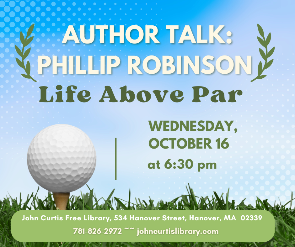 Author Talk: Phillip Robinson Wednesday, October 16 at 6:30 pm Life Above PAR tracks author Phil Robinson's adventures through 60 years of golf. The adventures run the gamut of emotions -- from funny, to tragic, and even a couple about love. The book is set up like a round of golf. There are 18 holes (stories), a Halfway House with Chip Shots (short stories) and a 19th hole with favorite 19th holes and 19th hole encounters. It concludes with an Appendix featuring his 12 Step Guide for Successful Business Golf, Business Golf Stories, Favorite Fairway Finds and his Top 99 Courses played. Phil resides in Hanover, MA with his wife Tina. He has two sons, Erik and Kurt.