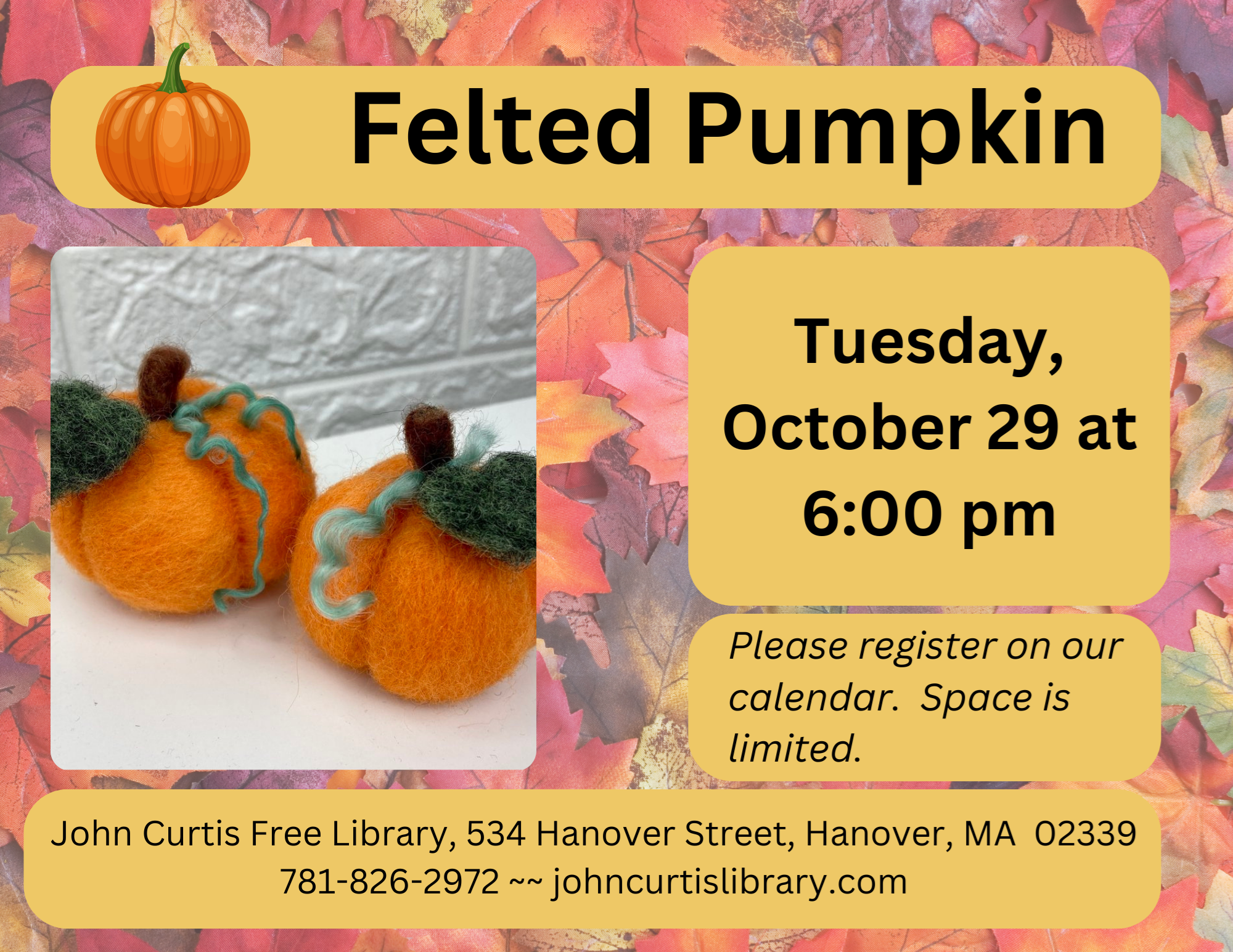 Felted Pumpkin Tuesday, October 29 at 6:00 pm Learn how to needle felt a pumpkin using wool roving and a barbed needle. Pop up Art School will show you the basics of needle felting. You’ll leave the class with the knowledge and basic supplies you need to continue felting on your own! Please note: Each patron will make one felted pumpkin.