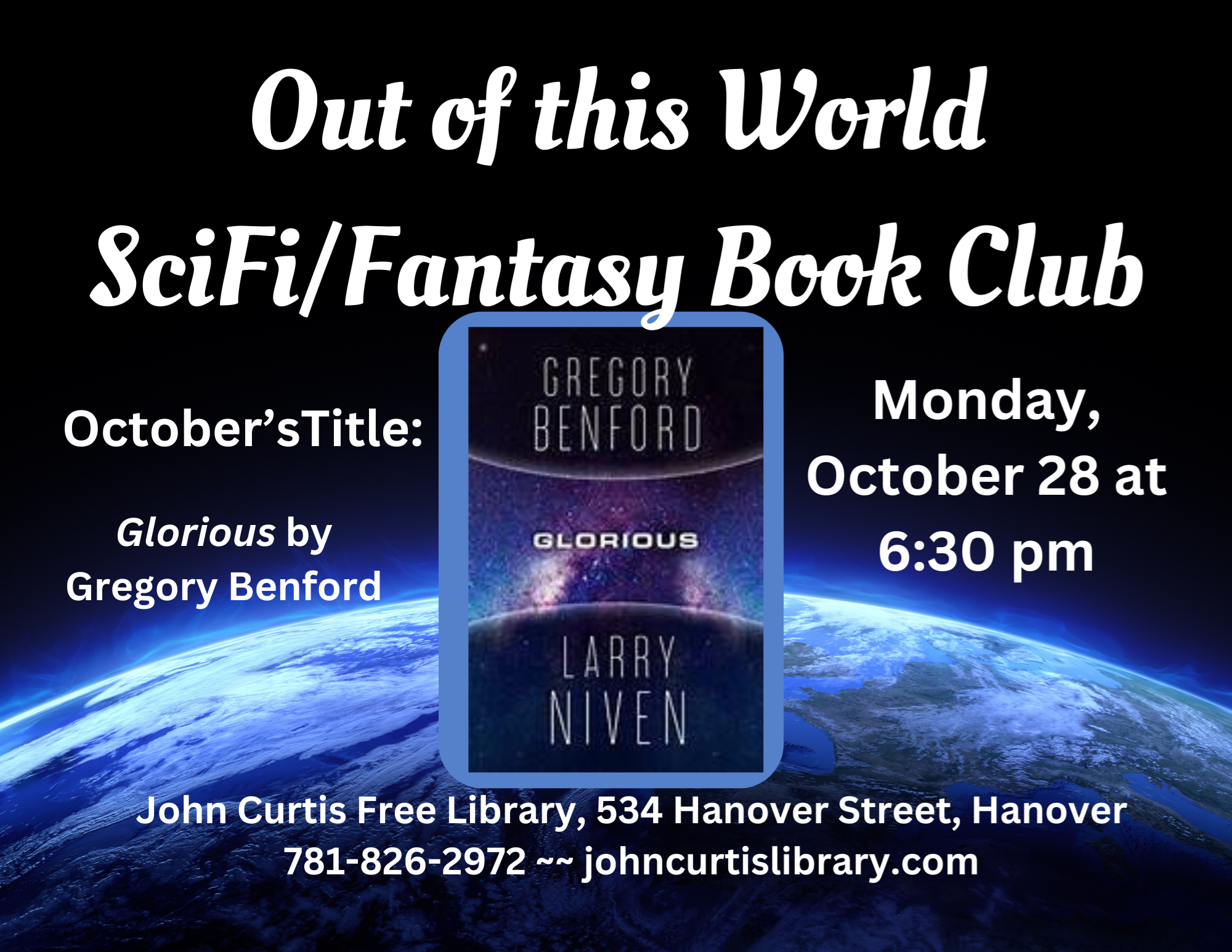 Out of This World SciFi/Fantasy Book Club Monday, October 28 at 6;30 pm Join us for the Out of This World Science Fiction / Fantasy Book Club! We meet on the last Monday of the month, and alternate between science fiction and fantasy titles. The title for October is Glorious by Gregory Benford
