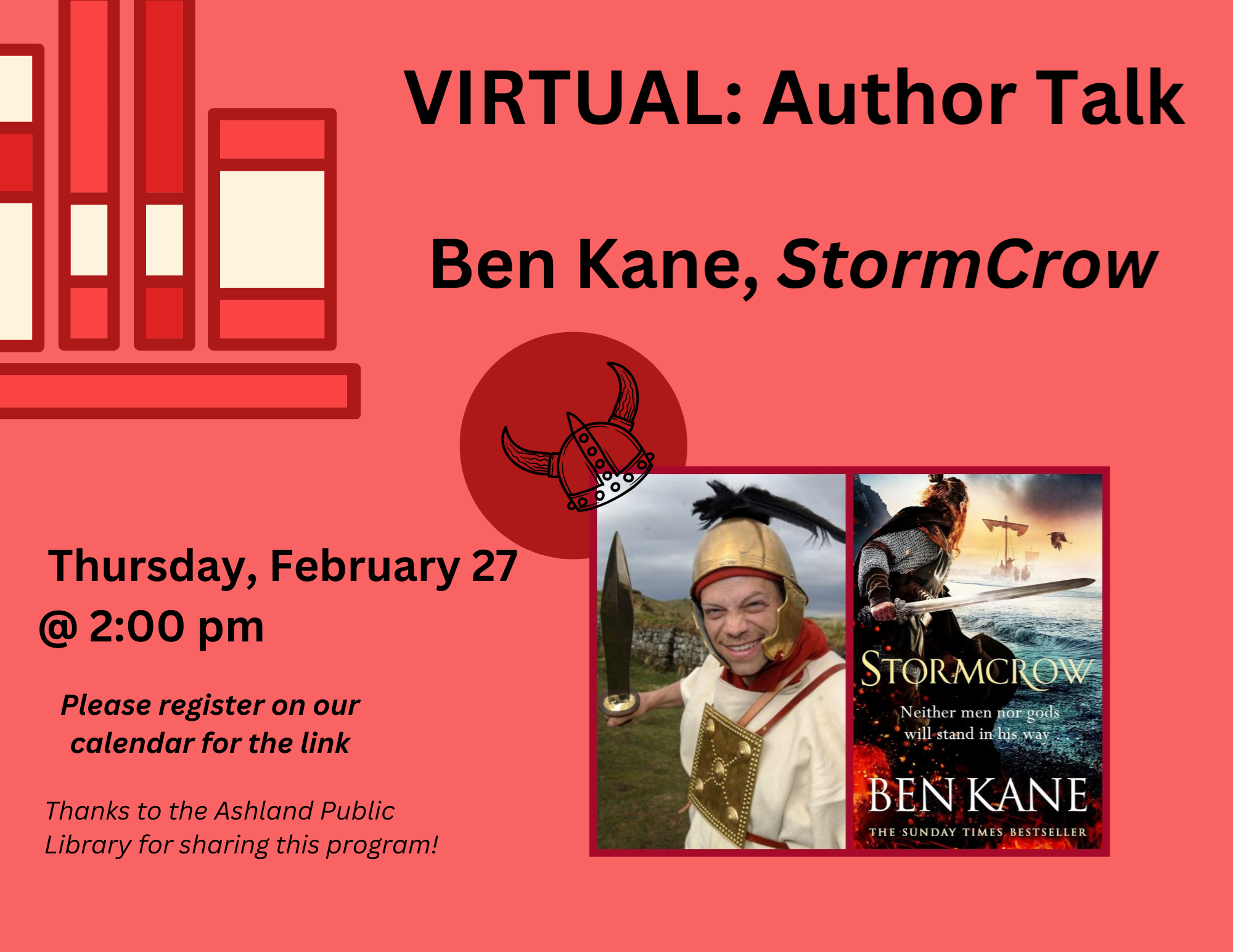 VIRTUAL: Author Talk with Ben Kane, StormCrow Thursday, February 27 at 2:00 pm Please join our conversation with author Ben Kane as he discusses StormCrow. On the east coast of Ireland thirteen-year old Finn finds the sword of a slain Norseman, and with Odin's raven watching, is given the name Stormcrow. When Finn's family is torn apart by a random act of violence, and the sword lost, he embarks on a quest for revenge with his oldest friend. Kenya born, Irish by blood and a UK resident, Ben Kane’s passion for history has taken him to more than 60 countries, and all 7 continents. During his travels and subsequent research, including walking hundreds of miles in Roman military gear, he has learned much about the Romans and the way they lived. Eleven of his eighteen novels have been Sunday Times bestsellers, and he has sold more than a million and a half books worldwide. He lives in Somerset, UK, with his children, where he writes full time. Thanks to the Ashland Public Library for sharing this program!