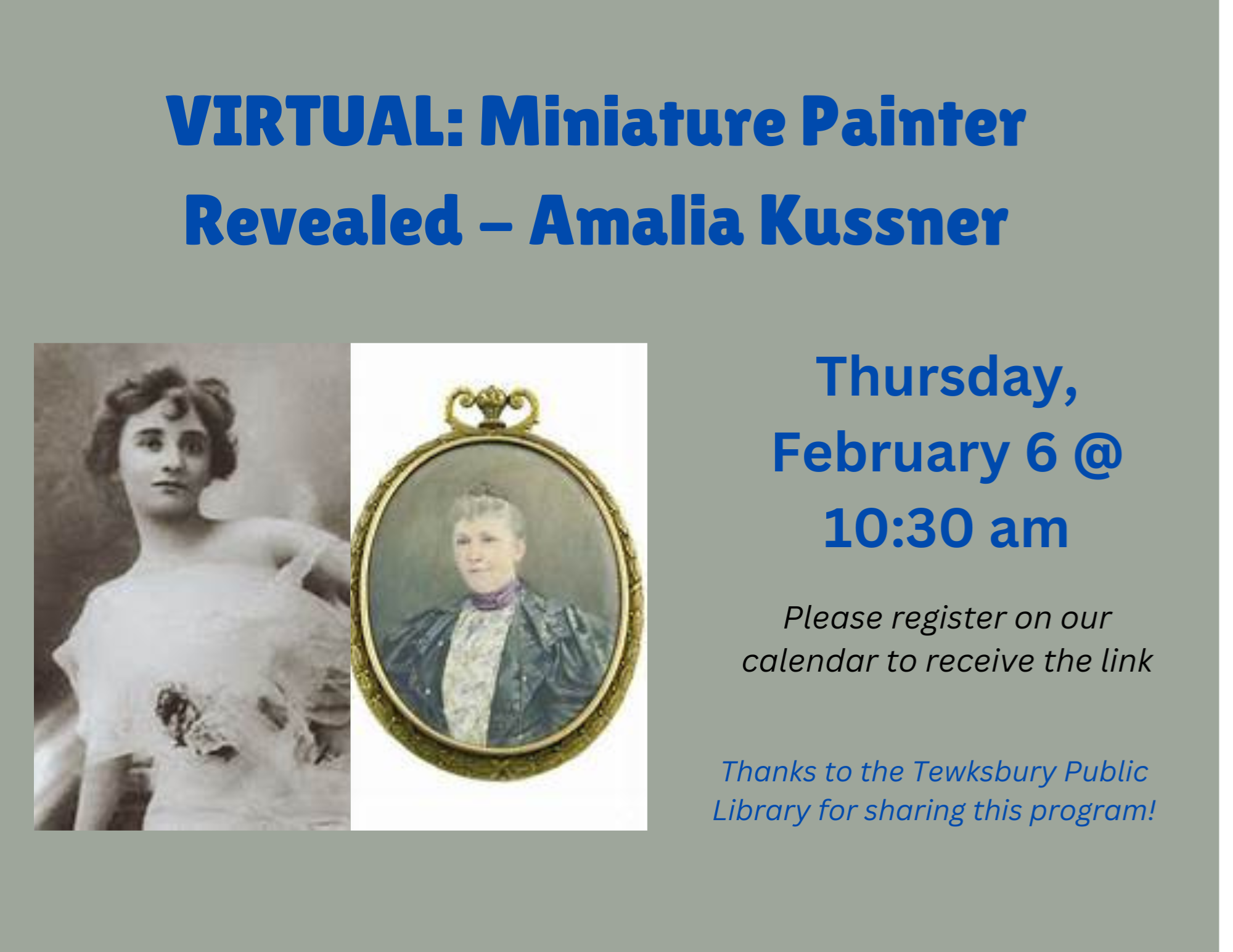 VIRTUAL: Miniature Painter Revealed - Amalia Kussner's Gilded Age Pursuit of Fame & Fortune Thursday, February 6 at 10:30 am No female portrait artists had the notoriety or esteemed clientèle that Amalia Kussner did. While photography was on the rise, miniatures had a feeling and soul to them that photos could not duplicate. Amalia’s portraits provided a grandeur that presented Gilded Age elite as American royalty. Her subjects included reigning social queen Mrs. Caroline Astor, Mrs. John Jacob Astor, Consuelo Vanderbilt, Mamie Fish, “dollar heiress” Minnie Paget, England’s Edward VII, Russia’s Czar Nicholas II and Alexandra, and diamond magnate Cecil Rhodes. From the mid-1890s to early 1910, having a Kussner miniature was just as important an accessory as owning fine jewelry or a mansion in Newport. Learn the riveting story of how one woman rose from simple beginnings to become one of the most sought-after miniaturists of the Gilded Age. Led by Kathleen Langone, historical researcher, host of the podcast, "People Hidden In History," and author of the forthcoming book, Miniature Painter Revealed: Amalia Kussner’s Gilded Age Pursuit of Fame and Fortune. Thank you to the Tewksbury Public Library for sharing this program!