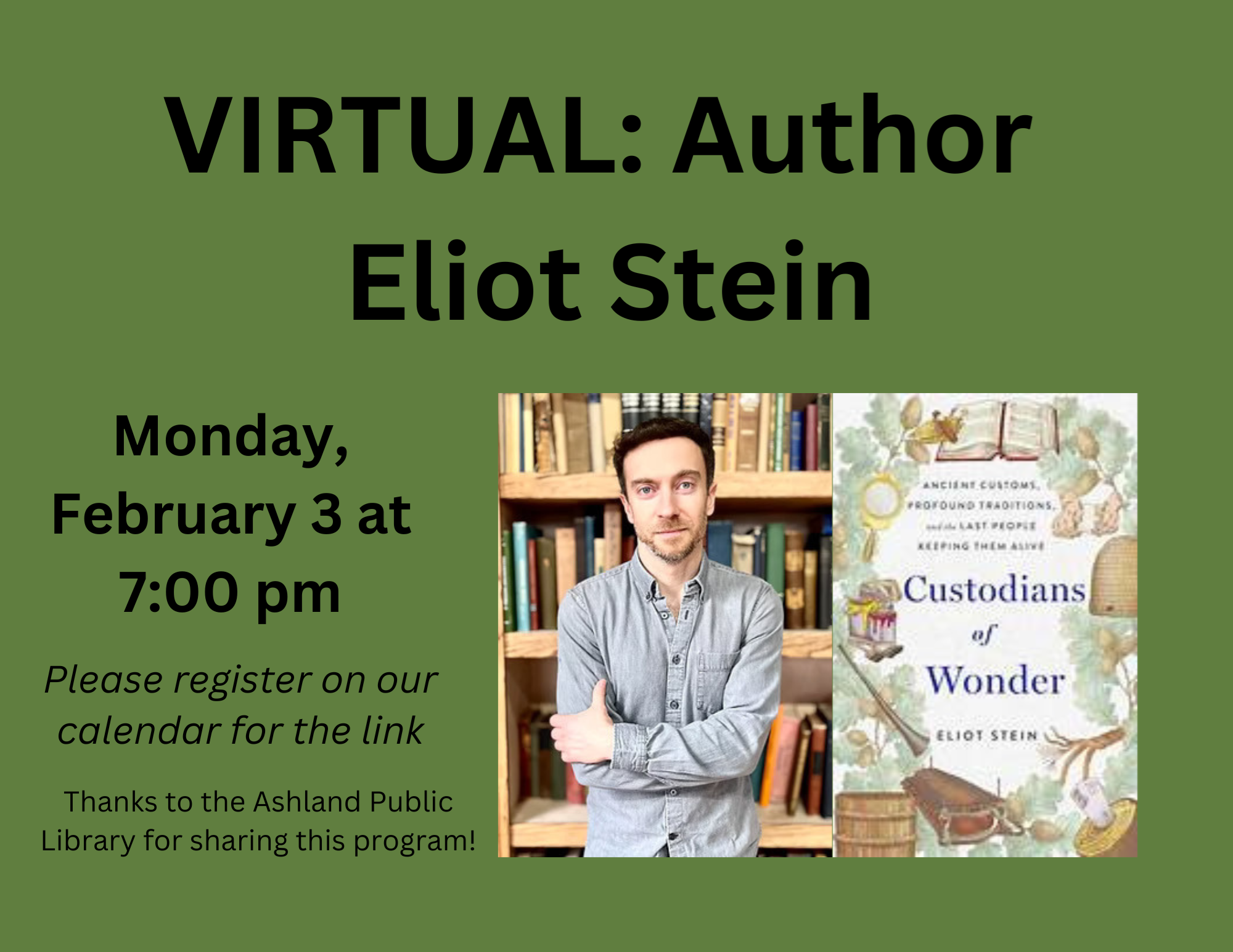 VIRTUAL: Author Talk with Eliot Stein, Custodians of Wonder Monday, February 3 at 7:00 pm Eliot Stein has traveled the globe in search of remarkable people who are preserving some of our most extraordinary cultural rites. In Custodians of Wonder: Ancient Customs, Profound Traditions, and the Last People Keeping Them Alive, Stein introduces readers to a man saving the secret ingredient in Japan's 700-year-old original soy sauce recipe. In Italy, he learns how to make the world's rarest pasta from one of the only women alive who knows how to make it. And in India, he discovers a family rumored to make a mysterious metal mirror believed to reveal your truest self. Stein uncovers an almost lost world. His work has appeared in The New York Times, WIRED, The Guardian, The Washington Post, Vice, Condé Nast Traveler, CNN, USA Today, National Geographic, The Independent, and elsewhere. He is a deputy editor at BBC Travel, with the column called Custom Made that highlights creative characters and cultural custodians making our world a more interesting place. Thanks to Ashland Public Library for sharing this program!