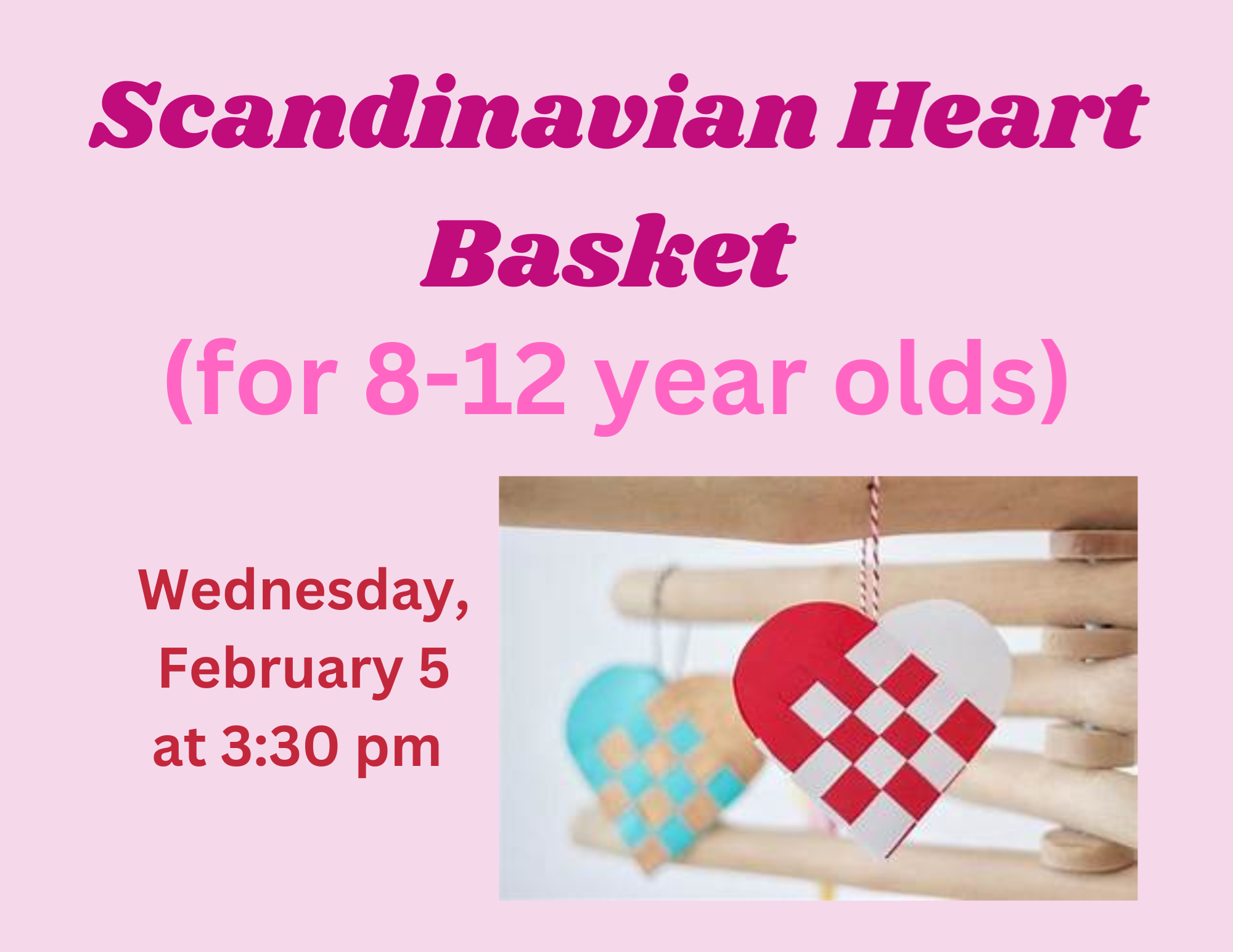Scandinavian Heart Basket Wednesday, February 5 at 3:30 pm For ages 8-12. Director Virginia Johnson instructs with this simple craft. All supplies included.