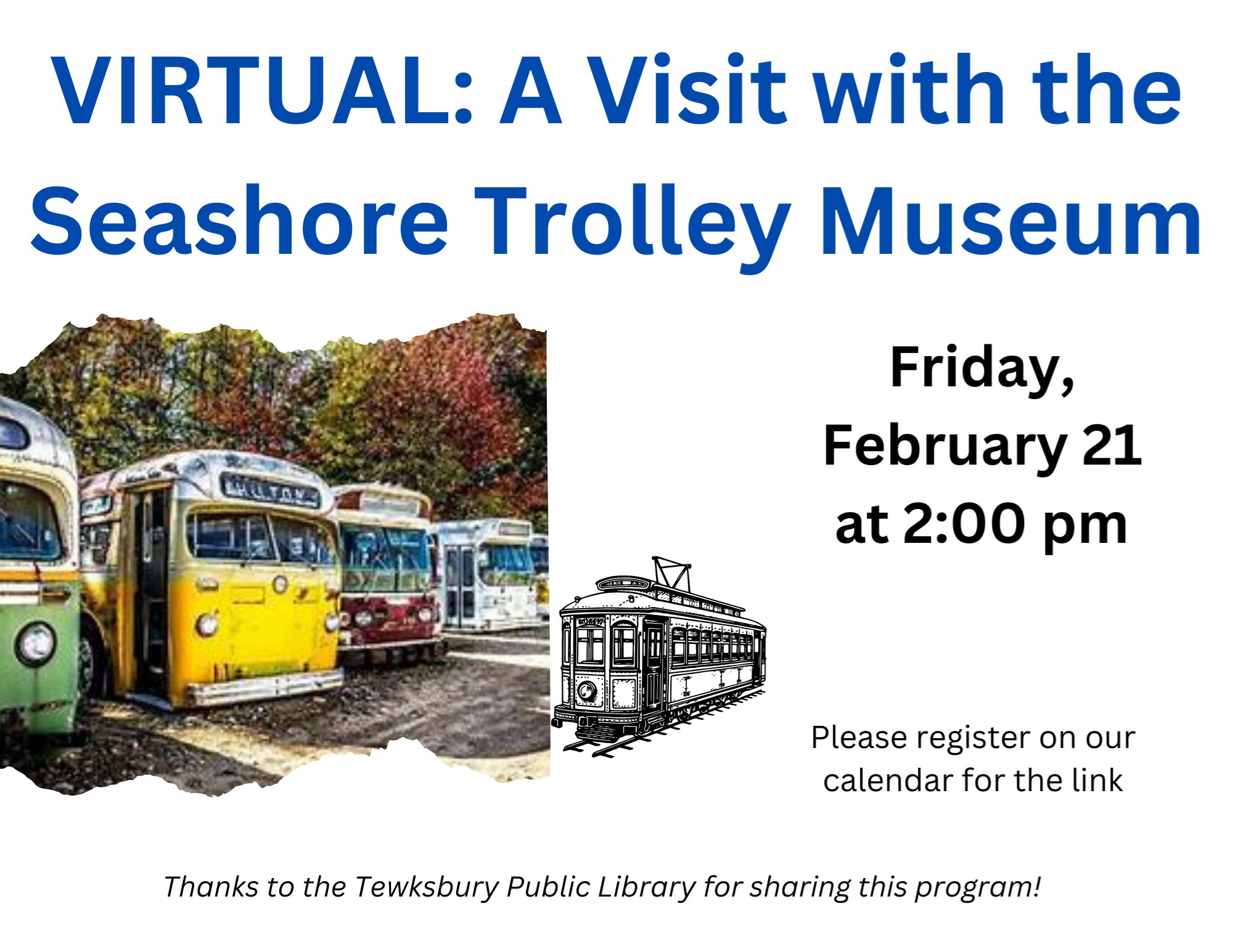 VIRTUAL: A Visit with the Seashore Trolley Museum Friday, February 21 at 2:00 pm All aboard! Learn about the history of the trolleys in America in this visit from the Seashore Trolley Museum in Kennebunkport, Maine and its satellite location, the National Street Car Museum in Lowell, Massachusetts. Founded in 1939, the Seashore Trolley Museum is the world's first and largest electric railway museum. The museum is operated by the New England Electric Railway Historical Society, which works to preserve knowledge, context, and resources for future generations by collecting, restoring, operating, and exhibiting significant public transit vehicles and artifacts. Thanks to the Tewksbury Public Library for sharing this program!