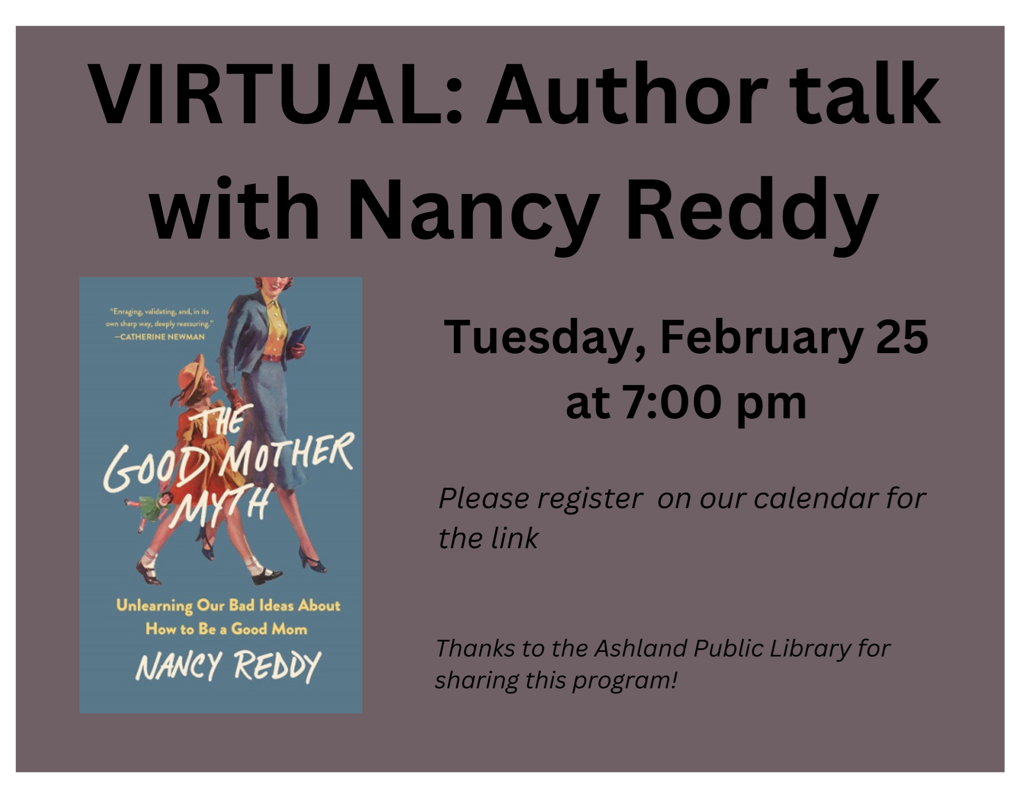 VIRTUAL: Author talk with Nancy Reddy, The Good Mother Myth Tuesday, February 25 at 7:00 pm Poet and Essayist, Nancy Reddy, joins us to discuss her book, The Good Mother Myth: Unlearning Our Bad Ideas About How to Be a Good Mom, a timely and thought-provoking debunking of the bad ideas that have for too long defined what it means to be a "good" mom. This program is for all of the caregivers who struggle to be the best they can be with societal pressures constantly trying to influence our good instincts. We hope you can join us for this important discussion. Her previous books include the poetry collection Pocket Universe and the anthology The Long Devotion: Poets Writing Motherhood, which she co-edited with Emily Pérez. She writes the newsletter Write More, Be Less Careful. You can find her on Instagram at nancy.o.reddy. Thanks to the Ashland Public Library for sharing this program!
