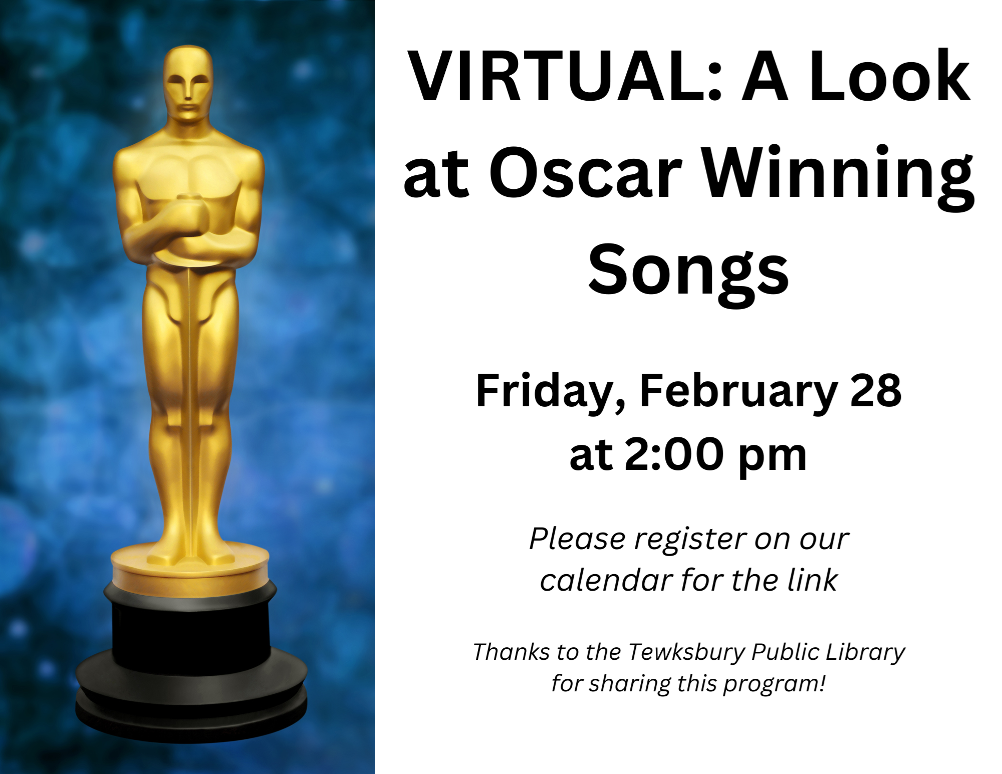 VIRTUAL: A Look at Oscar Winning Songs Friday, February 28 at 2:00 pm Since 1934 the Academy of Motion Picture Arts and Sciences (AMPAS) has recognized one song written specifically for film released during the previous calendar year as worthy of an “Oscar." Past winners have included such wonderful numbers as "Moon River," "It Might As Well Be Spring," "All the Way" and "Over the Rainbow." Enjoy archival video clips of the actual presenters and recipients for over a dozen of these classic songs as well as experience many of the original artists’ renditions as they were first introduced to movie audiences. Led by Rich Knox, a retired school teacher and administrator, who lectures on musicals, films, and opera to libraries across the country. Thanks to the Tewksbury Public Library for sharing this program!