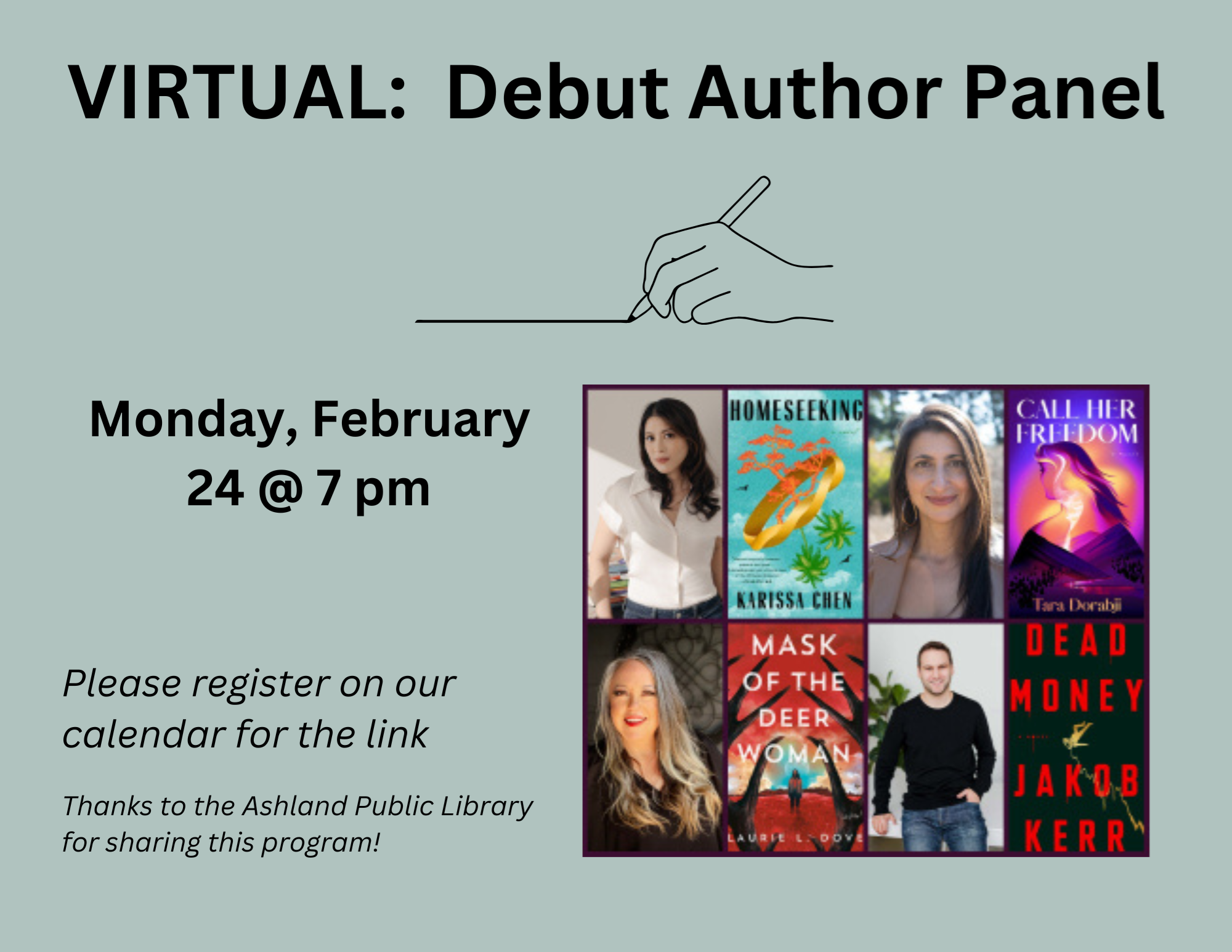 VIRTUAL: Debut Author Panel with Karissa Chen, Tara Dorabji, Laurie L. Dove, and Jakob Kerr Monday, February 24 at 7:00 pm We welcome authors Karissa Chen, Tara Dorabji, Laurie L. Dove, and Jakob Kerr to our virtual stage. We'll be talking all about getting into publishing, the pitfalls, challenges, and roadblocks as well as the excitement, fulfillment, and reader enthusiasm that makes it all worthwhile. Bring your questions as this will be in a Q&A format. All four of our authors have books coming out in January 2025 - how awesome is that!?! For more information about the authors, please see our calendar. Photo credits: Karissa Chen by Ernie Chang, Tara Dorabji by Sheila Menezes, and Jakob Kerr by Ashley Courter Thanks to the Ashland Public Library for sharing this program!