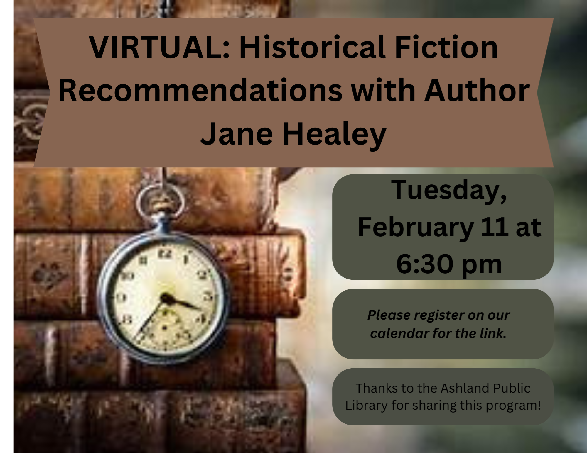 VIRTUAL: Historical Fiction Recommendations with Author Jane Healey Tuesday, February 11 at 6:30 pm Love Historical Fiction but not sure what to read next? Join bestselling author, Jane Healey, monthly for 30 minutes of pure book recommendations - the best of historical fiction out there! We're sure you'll find something to like from Jane's many enthusiastic reviews. Jane Healey is the author of The Beantown Girls, a Washington Post and Amazon Charts bestseller, The Secret Stealers, which was an Amazon First Reads Editor’s Pick and a Historical Novel Society’s Editors’ Choice, and her debut, The Saturday Evening Girls Club. Goodnight from Paris is her newly released novel from Lake Union Publishing. Jane is also the host of Historical Happy Hour, a monthly webinar and podcast featuring interviews with premier historical fiction authors and their latest novels. Thanks to the Ashland Public Library for sharing this program!