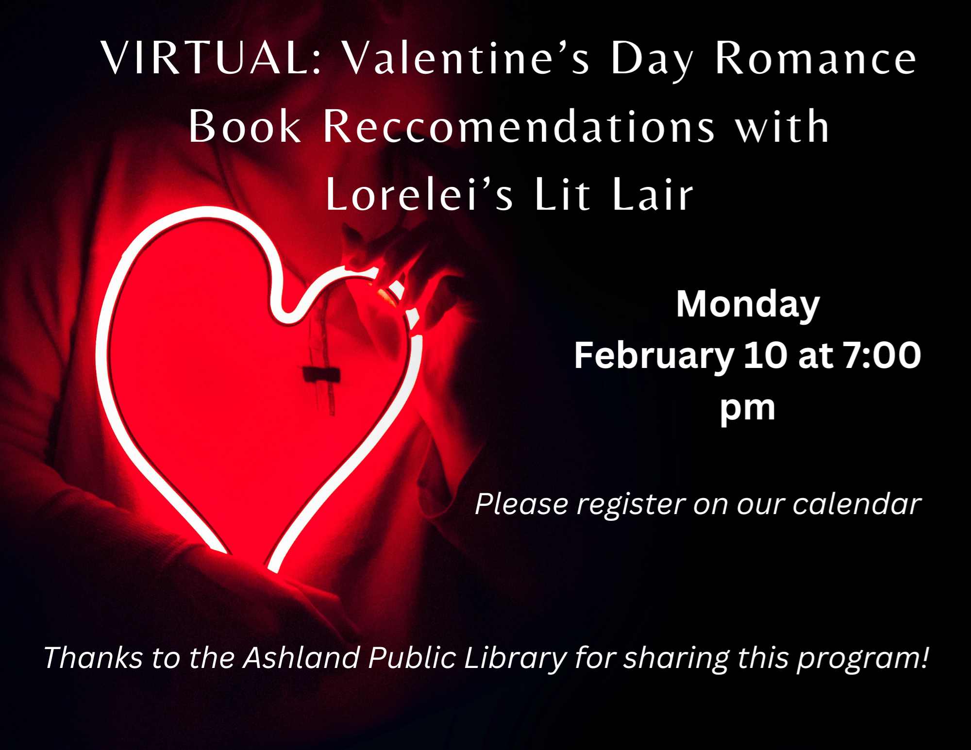 VIRTUAL: Gal/Pal/Valentine's Day Romance Book Recommendations with Lorelei's Lit Lair Monday, February 10 at 7:00 pm If you know romance, you probably know Lorelei! Affectionately referred to as a passionate Romance Ambassador, Lorelei has been offering book recommendations, author spotlights, giveaways and connecting authors with readers through social media since 2010, providing a safe and friendly environment for book lovers around the globe. Lorelei will be giving us book recs for this special holiday - not only for couples, but pals and gals. So, if you love a good romantic story, one that has a good group of friends, and/or a tight knit circle of women, this program is for you! And, if your pile isn't already groaning, it will be! Romance book lovers can join the "Let’s Talk Romance Books" Social Club, an exclusive virtual membership where readers can now enjoy Lorelei’s in-person signature style reader events from the comfort of their home, introducing up and coming, and acclaimed bestselling authors in a fun and entertaining way inside a safe and friendly online community. You can also join her Free Membership at Lorelei's Lit Lair. Thanks to the Ashland Public Library for sharing this program!