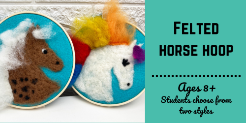 Felted Horse Hoop with PopUp Art School Friday, February 21 at 3:00 pm For ages 8 and up. Discover the magical world of needle felting in this fun and beginner-friendly class! Learn how to needle felt a beautiful horse or unicorn onto a hoop. Choose a natural look or go whimsical with a colorful rainbow mane.