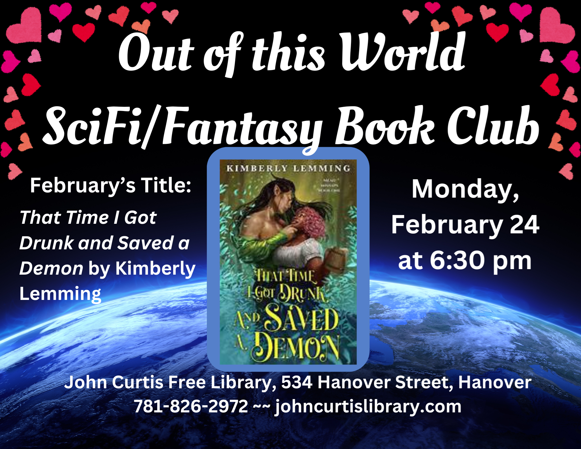 Out of this World Science Fiction/Fantasy Book Club Monday, February 24 at 6:30 pm Join us for the Out of This World Science Fiction / Fantasy Book Club! We meet on the last Monday of the month, and alternate between science fiction and fantasy titles. The title for February is That Time I Got Drunk and Saved a Demon by Kimberly Lemming