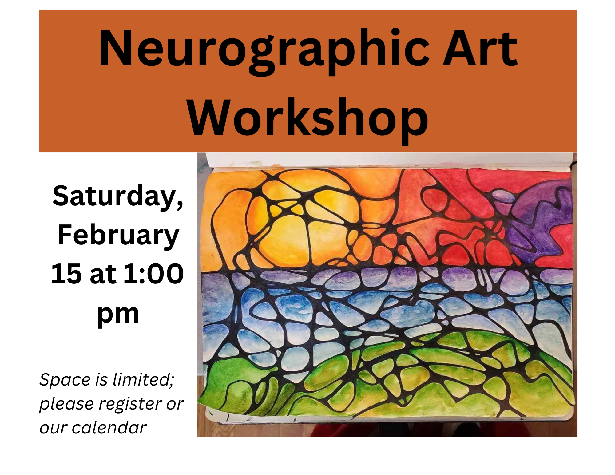 Neurographic Art Workshop Saturday, February 15 at 1:00 pm Join us for a relaxing workshop on neurographic art! This simple and creative process uses shapes and flowing lines to help reduce stress, spark creativity, and connect with your inner self. No art experience is needed—just come ready to unwind and explore! We will also do a relaxing guided meditation to inspire you for the new year!