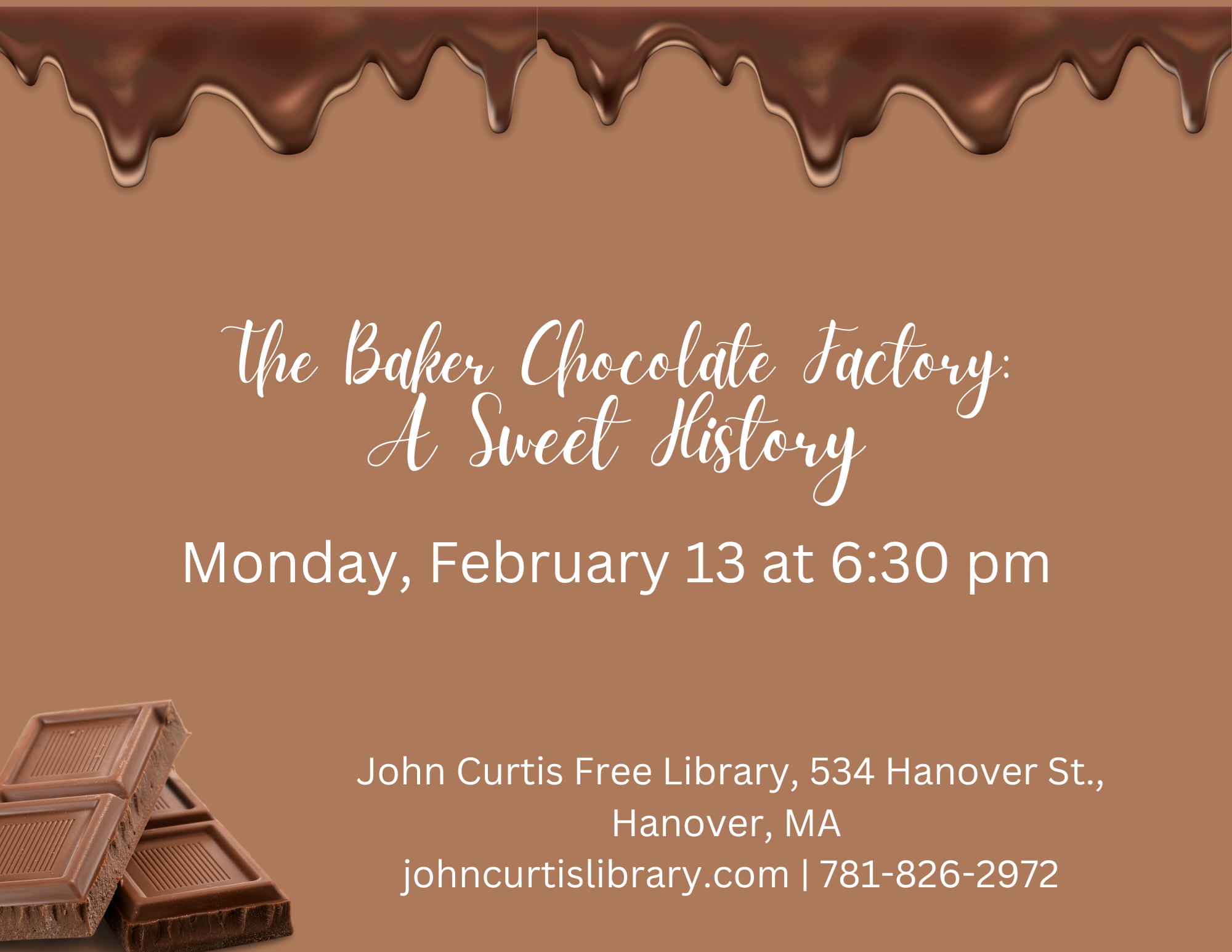 The Baker Chocolate Factory: A Sweet History Monday, February 13, 2023 at 6:30 pm In the not so distant past, you couldn't go through lower mills without smelling chocolate! Join local author Anthony Sammarco as he takes us on a memory-filled tour of the former Baker Chocolate Factory!