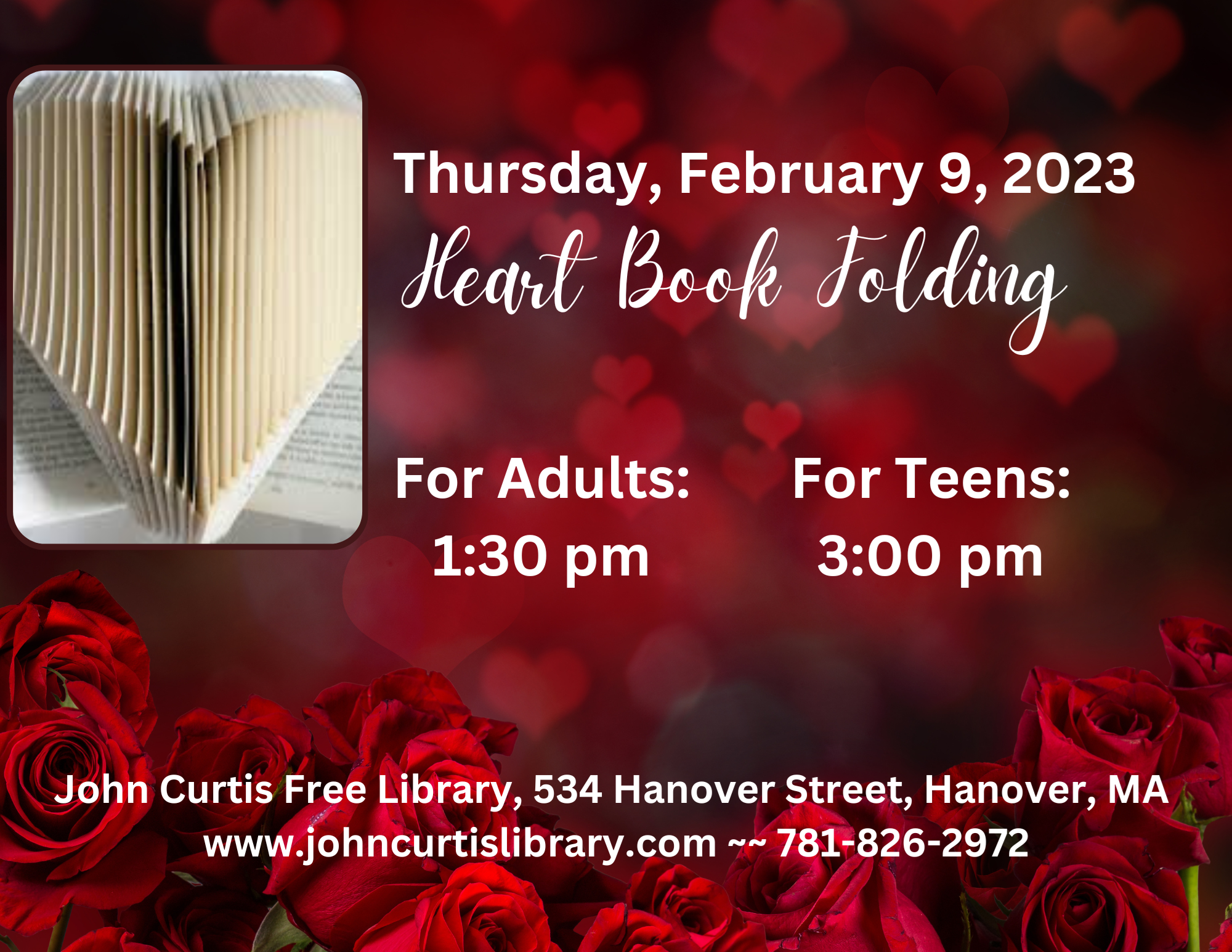 Heart Book Folding Thursday, February 9, 2023 at 1:30 pm MORE book folding! If you enjoyed (or missed) our one in December, we thought we'd present another, just in time for Valentine's Day! All materials will be provided.
