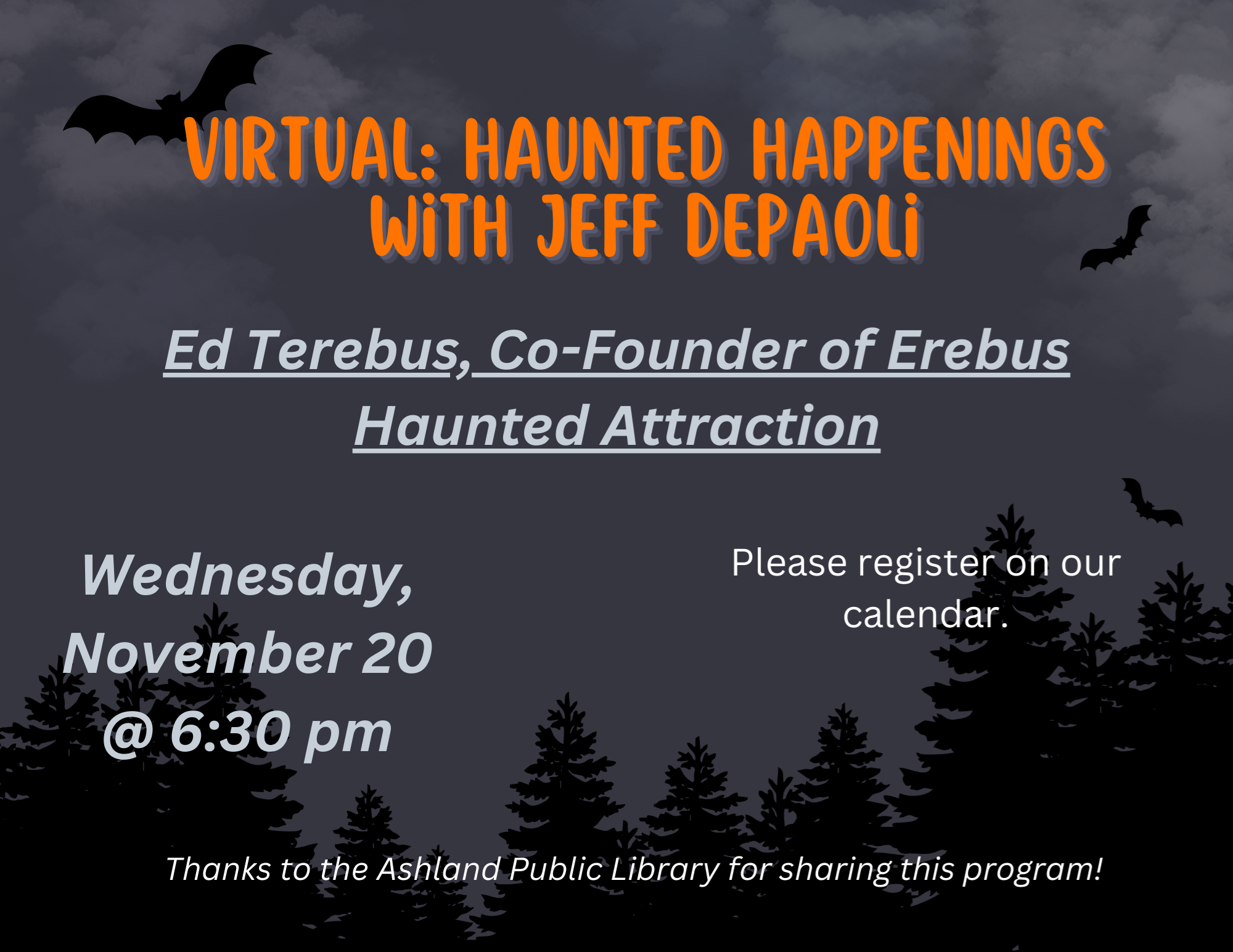 VIRTUAL: Haunted Happenings with Jeff DePaoli Ed Terebus, Co-Founder of Erebus Haunted Attraction Wednesday, November 20 at 6:30 pm Join Ed Terebus, Co-Founder of Erebus Haunted Attraction and Jeff DePaoli, host of "That Halloween Podcast", as they talk all about one of the largest and most intense haunted houses in the country. Welcome to Erebus Haunted Attraction, where we specialize in delivering an unforgettable, spine-chilling experience. Located in Pontiac, Michigan, we're proud to be one of the largest and most intense haunted houses in the country. With four floors of immersive terror, you'll encounter horrifying monsters, otherworldly environments, and live actors that pull you deeper into the nightmare. Our cutting-edge special effects and interactive scares make every single step unpredictable. Whether you're a horror fanatic or a first-time thrill seeker, we guarantee new surprises and heart-pounding moments each year. Step inside, if you dare, and see why Erebus is the ultimate Halloween adventure! Can you endure over a half-mile indoor walk through one of the world's largest haunted attractions? Thanks to the Ashland Public Library for sharing this program!