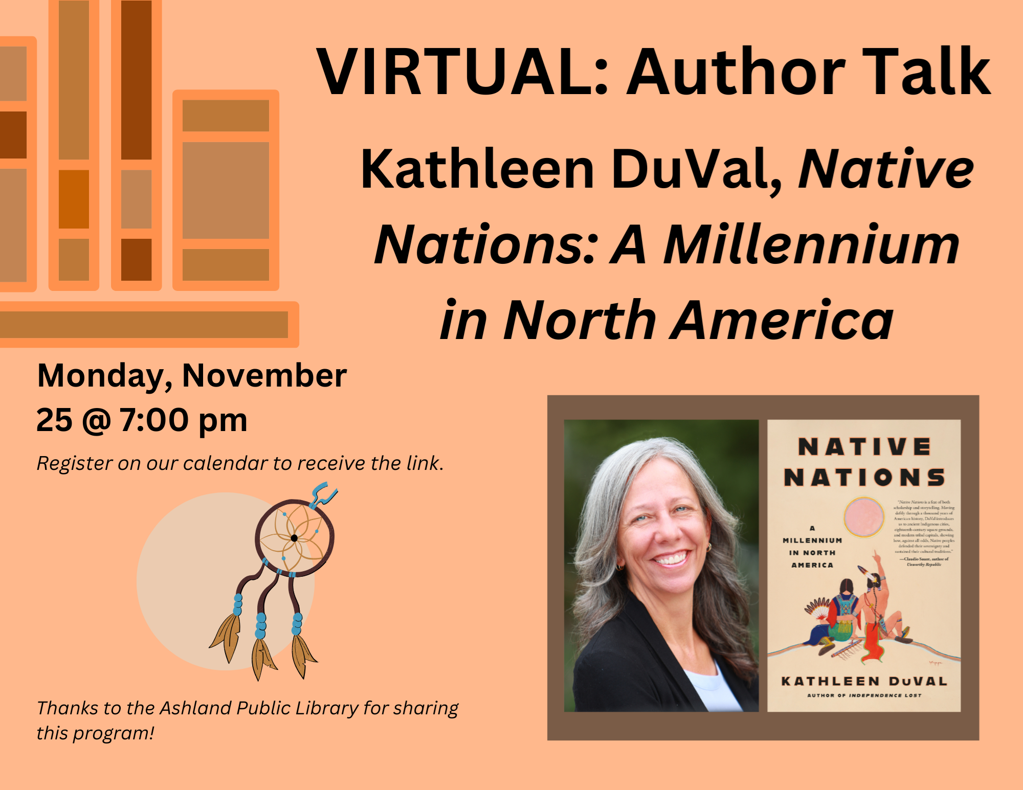 VIRTUAL: Author Talk with Kathleen DuVal Monday, November 25 at 7:00 pm We are endlessly interested in learning about Indigenous Peoples and this is the perfect conversation to have to get much more insight into the resilience and battle for self-sovereigncy. We are joined by Professor, Historian, and Author Kathleen DuVal as she discusses her book, "Native Nations A Millennium in North America" - 'An essential American history' (The Wall Street Journal) that places the power of Native nations at its center, telling their story from the rise of ancient cities more than a thousand years ago to fights for sovereignty that continue today. Thanks to the Ashland Public Library for sharing this program!