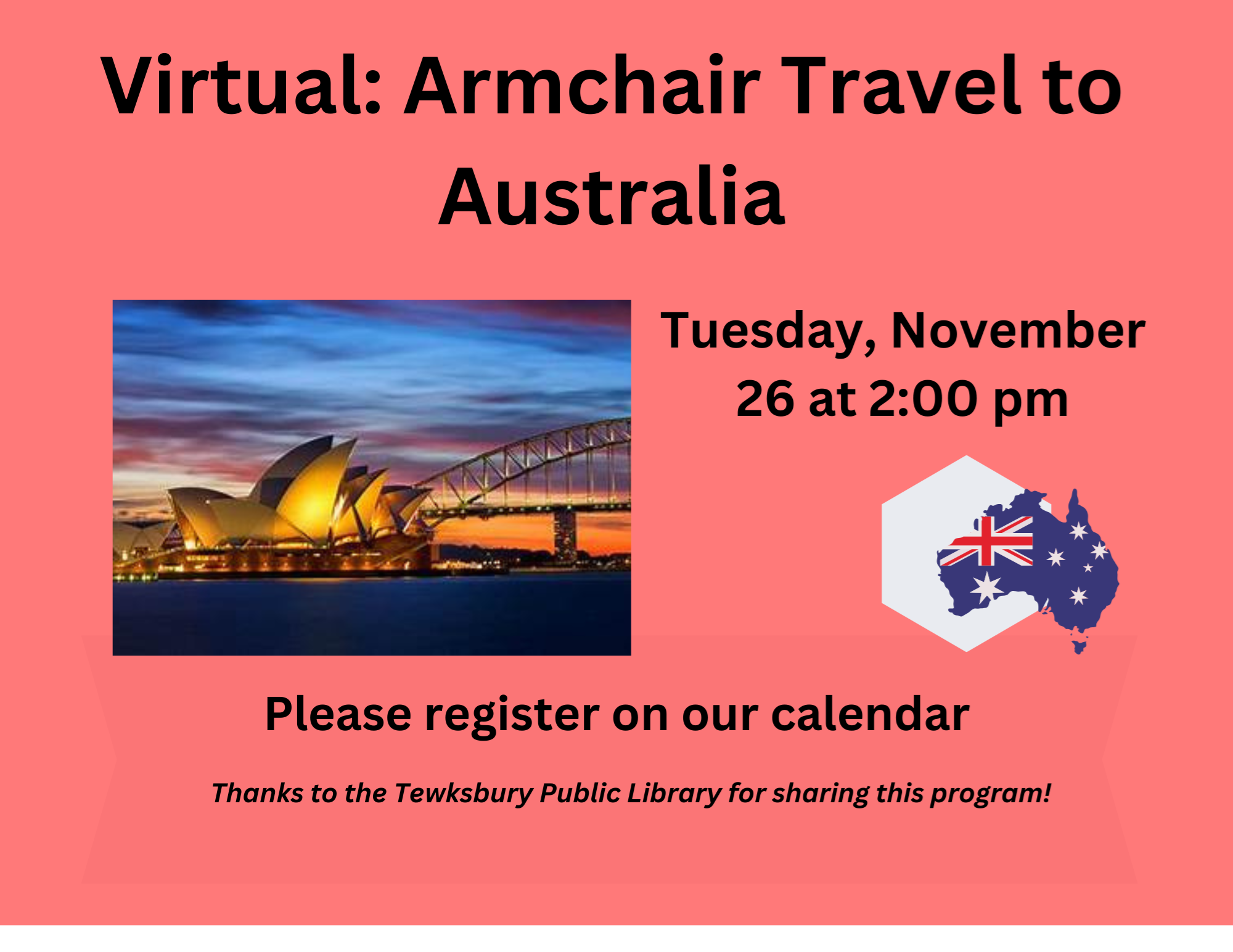 VIRTUAL: Armchair Travel to Australia Tuesday, November 26 at 2:00 pm Travel to Melbourne and Tasmania, Australia. Led by Jack Holmes, a travel photographer and owner of "Images From Near and Far" at Western Avenue Studios in Lowell. A retired high school teacher, he previously served as President of the Greater Lynn Photographic Association and Gallery Manager of the Loading Dock Gallery in Lowell. RECORDING NOTE: This program will be recorded. All registrants will receive the recording via email within 48 hours of the program. Thanks to the Tewksbury Public Library for sharing this program!