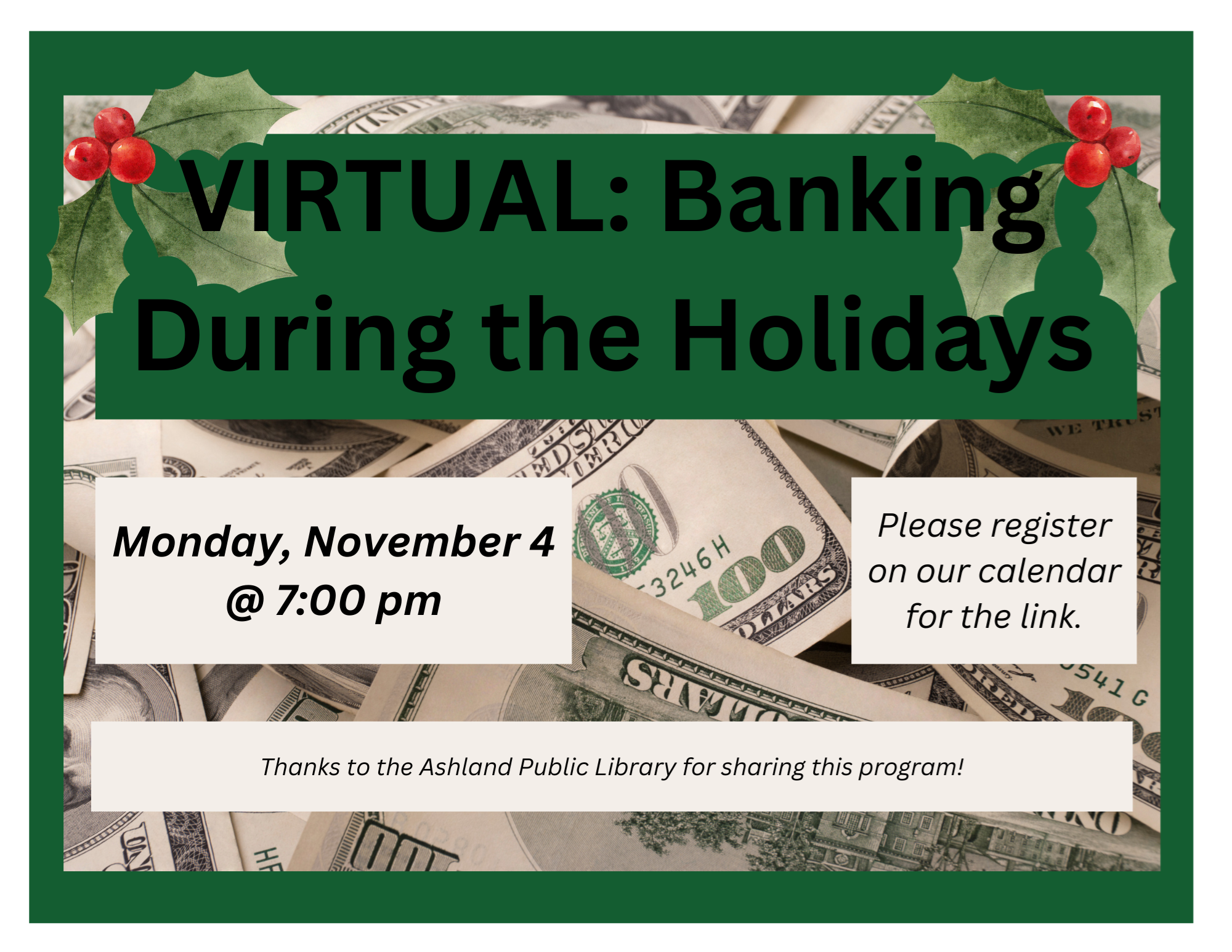 VIRTUAL: Banking During the Holidays Monday, November 4 at 7:00 pm We're so happy to be partnering with representatives of Needham Bank to discuss how to get through the holidays with your money and sanity intact! We'll be chatting about topics ranging from protecting your credit and debit cards, saving for the holidays, strategies to budget for the holiday season and not overspend, and watching out for holiday scams. There is something for everyone and every age so we hope you can join us for this important conversation and Q&A. Representatives from Needham Bank will be joining to share important information for consumers during the rushed holiday time. Whether you live in a community where there is a Needham Bank Branch or not, they'll be sharing tips and tricks to make sure you come out of the holidays with less stress and more joy. Thanks to Ashland Public Library for sharing this program!