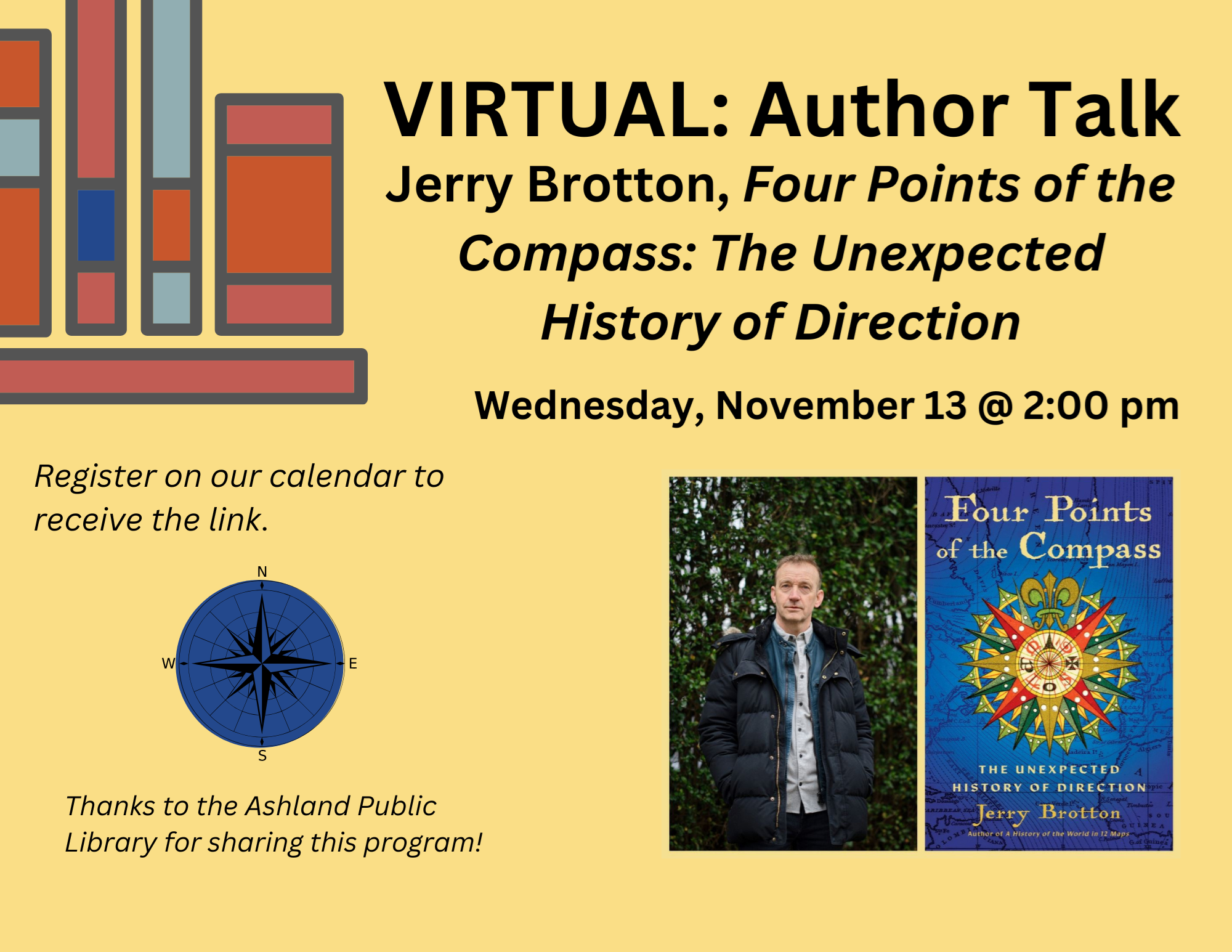 VIRTUAL: Author Talk with Jerry Brotton Wednesday, November 13 at 2:00 pm We're so happy to be chatting with author Jerry Brotton on his book, "Four Points of the Compass: The Unexpected History of Direction" (released on Nov 5th - it's also a book birthday!). As we head into the busy holiday travels, don't you wonder about where you are going and why? How did the four directions - North, South, East, and West become a thing? Whether you are directionally challenged or savvy, this program is for you! Jerry will be answering these and so many other directional questions. We hope you can join us for this fascinating conversation! Jerry Brotton is a professor of English and History at the University of London. A renowned broadcaster, curator, and critic, he is the author of the New York Times bestselling, award-winning A History of the World in 12 Maps, which has been translated into nineteen languages, The Sultan and the Queen, a Financial Times and Waterstones Book of the Year and winner of the Historical Writer’s Association Prize, The Renaissance Bazaar, and The Sale of the Late King’s Goods, a finalist for the Samuel Johnson Prize. He lives in London. Thanks to Ashland Public Library for sharing this program!