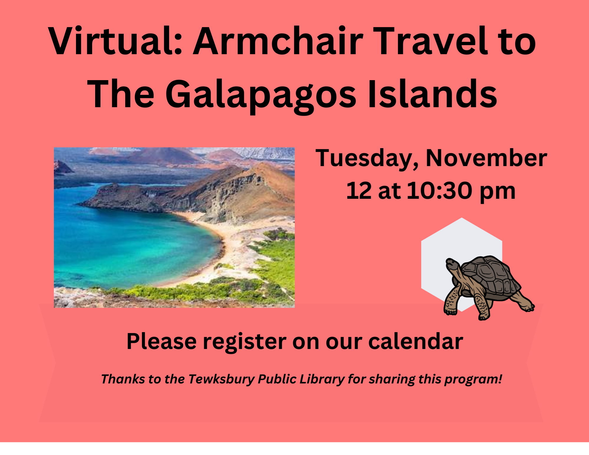 VIRTUAL: Armchair Travel to the Galapagos Islands Tuesday, November 12 at 10:30 am Travel to the Galapagos Islands made famous by Charles Darwin and his theories of evolution in his book, The Origin of Species, aboard the ship, HMS Beagle. Examine the unique wildlife and gorgeous vistas of this isolated group of islands, located 600 miles west of Ecuador’s Pacific coast, which is home to large tortoises, iguana lizards, sea lions, and a menagerie of exceptional birds from blue-footed boobies to red pouched frigate birds. Appreciate the nearly pristine showcase of biodiversity as told through videos and photos. Led by world traveler Dana Zaiser, a retired local pharmacist who has also visited Switzerland, Australia, Ireland and The Amazon. In addition to his love of travel, Zaiser is an amateur historian and current President of the Old Colony Civil War Roundtable. RECORDING NOTE: This program will be recorded. All registrants will receive the recording via email within 48 hours of the program. Thanks to the Tewksbury Public Library for sharing this program!