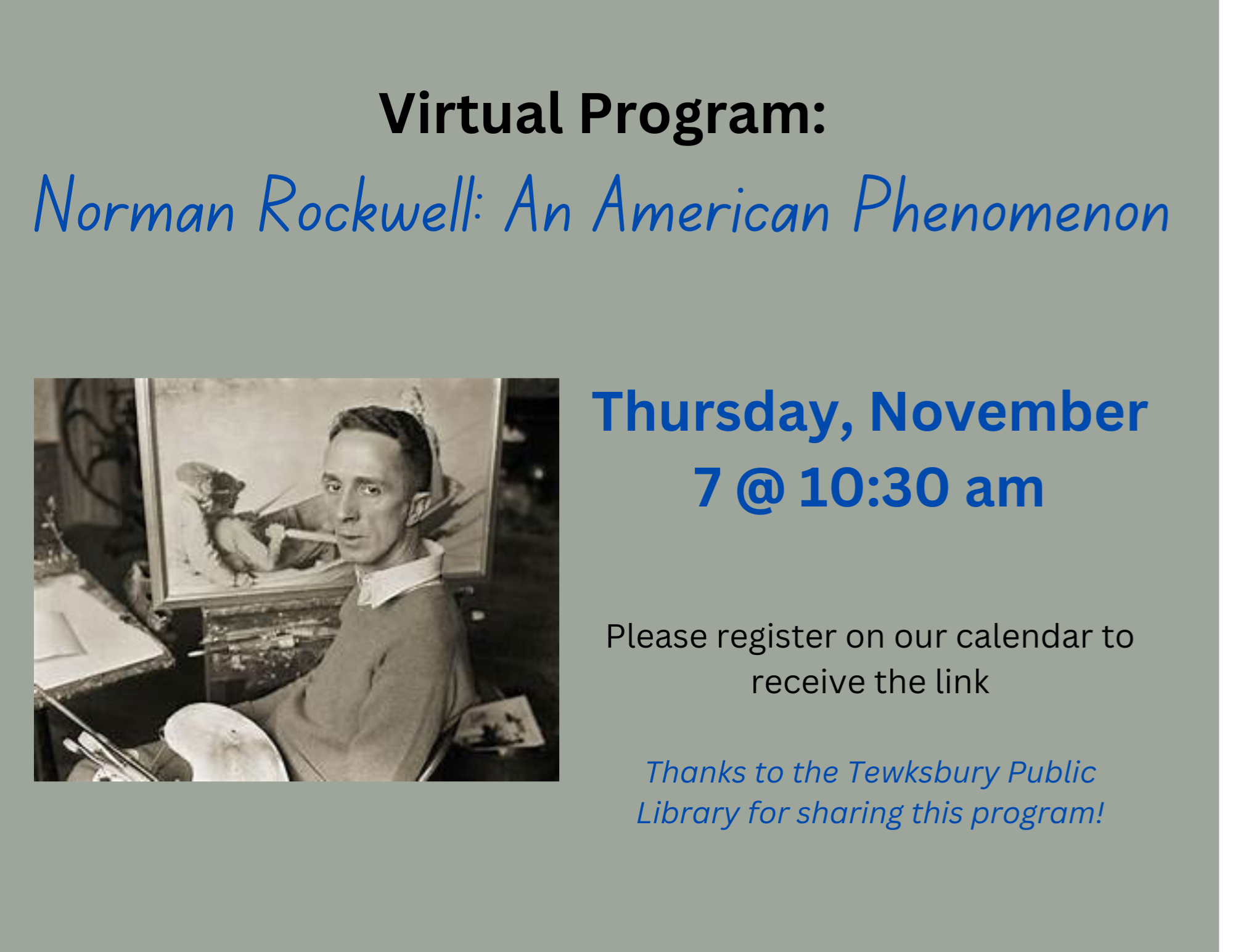 VIRTUAL: Norman Rockwell, An American Phenomenon Thursday, November 7 at 10:30 am The prolific American artist and illustrator Norman Rockwell produced more than 4,000 works that chronicle not only ordinary moments from everyday life but also important social and political issues. Examine why and how he has remained a beloved American original, despite being dismissed by many of the serious art critics of his time. Explore many of his iconic paintings, as well as some that may surprise you. Led by Janet Mandel, a retired 32-year art history teacher, who now presents illustrated talks on a variety of art history topics at colleges & universities, libraries, museums, senior centers, and community centers. RECORDING NOTE: This program will be recorded. All registrants will receive the recording via email within 48 hours of the program. Thanks to the Tewksbury Public Library for sharing this program! .