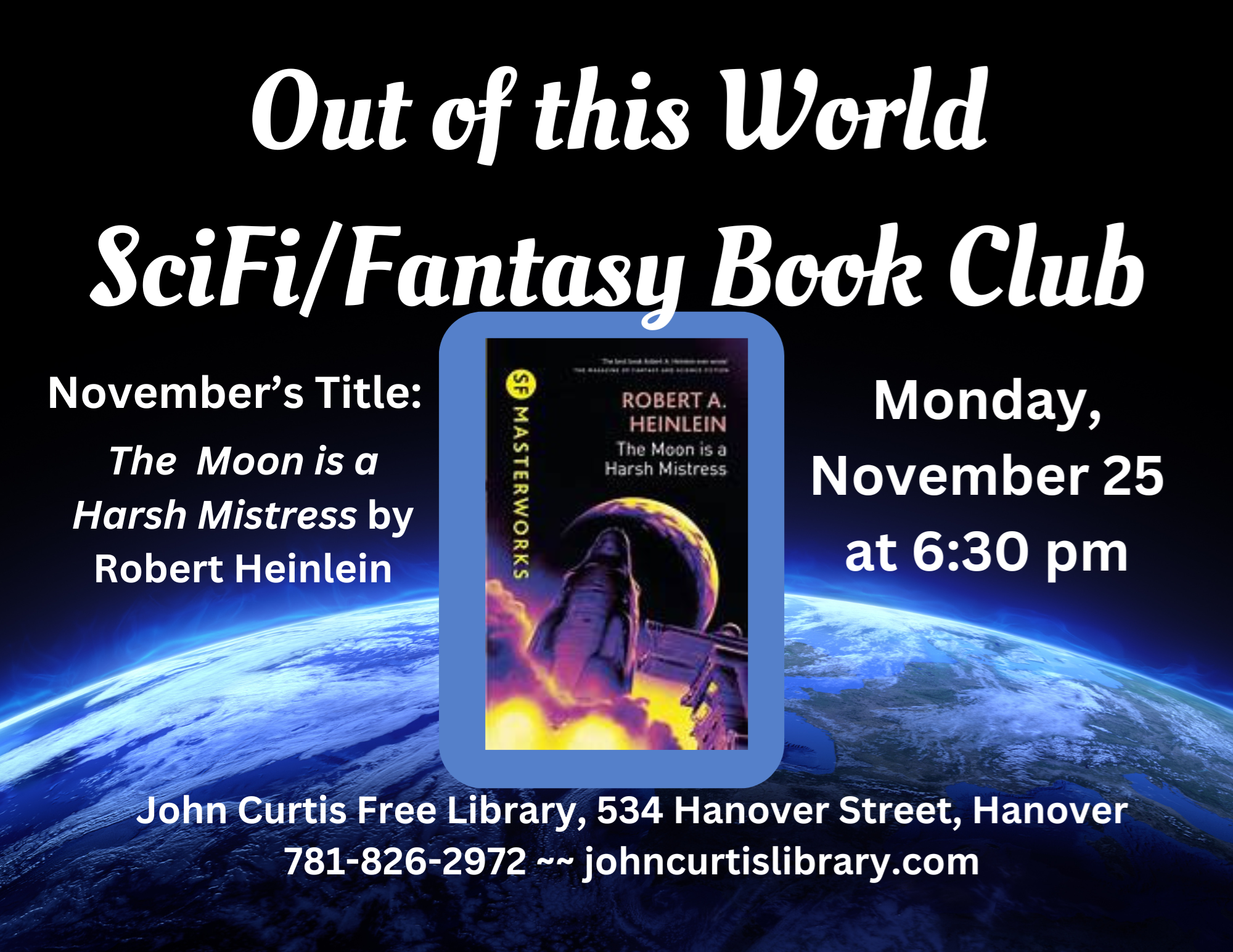 Out of This World Science Fiction/Fantasy Book Club Monday, November 25 at 6:30 pm Join us for the Out of This World Science Fiction / Fantasy Book Club! We meet on the last Monday of the month, and alternate between science fiction and fantasy titles.