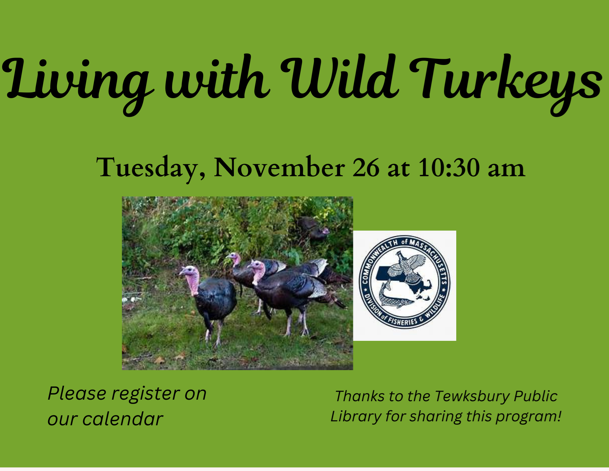 VIRTUAL: Living with Wild Turkeys Tuesday, November 26 at 10:30 am Wild turkeys, the official game bird of Massachusetts, thrive in a variety of habitats across the Commonwealth, including in urban and suburban areas. Learn about wild turkey biology and behavior, as well as how residents can coexist with these beautiful birds. Led by Meghan Crawford, Community Engagement Biologist with MassWildlife, and David Scarpitti, Turkey Biologist with MassWildlife. RECORDING NOTE: This program will be recorded. All registrants will receive the recording via email within 48 hours of the program. Thanks to the Tewksbury Public Library for sharing this program!