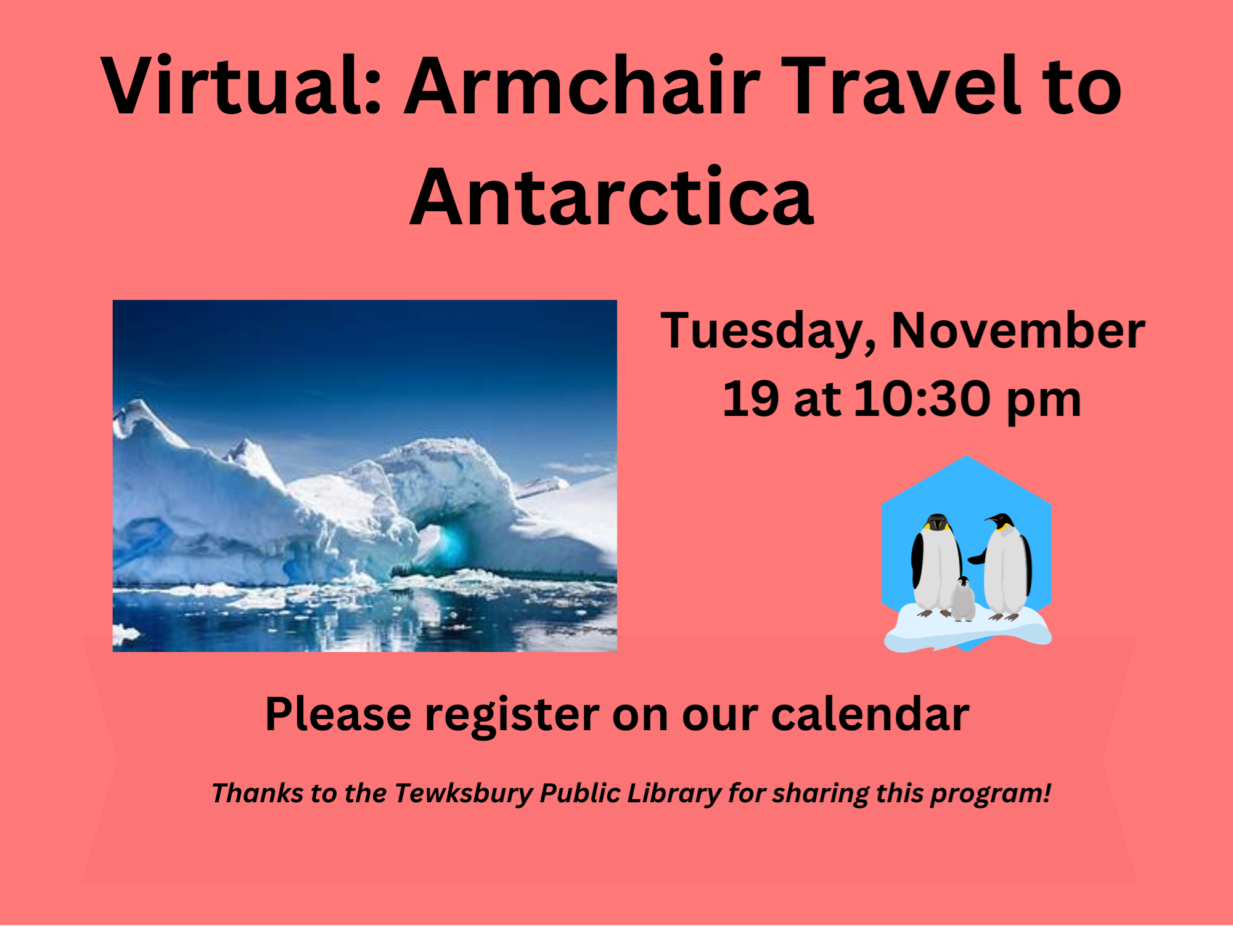 VIRTUAL: Armchair Travel To Antarctica Tuesday, November 19 at 10:30 am Take a virtual cruise with stops on the Falkland (Malvina) Islands, South Georgia Island, Elephant Island, and the Antarctic Peninsula. Enjoy stunning photographs of the abundant wildlife (e.g., Gentoo and Adelie penguins, Southern Giant-Petrels, Leopard Seals), as well as the many places made famous by Sir Ernest Shackleton’s Antarctic expedition. Led by Bill Gette, Founding Director of Mass Audubon’s Joppa Flats Education Center in Newburyport, who has over 30 years of experience leading groups to exciting local, domestic, and international destinations. He has visited all seven continents, led groups on over 50 international travel programs, and conducted hundreds of field trips locally and throughout the United States. RECORDING NOTE: This program will be recorded. All registrants will receive the recording via email within 48 hours of the program. Thanks to the Tewksbury Public Library for sharing this program!