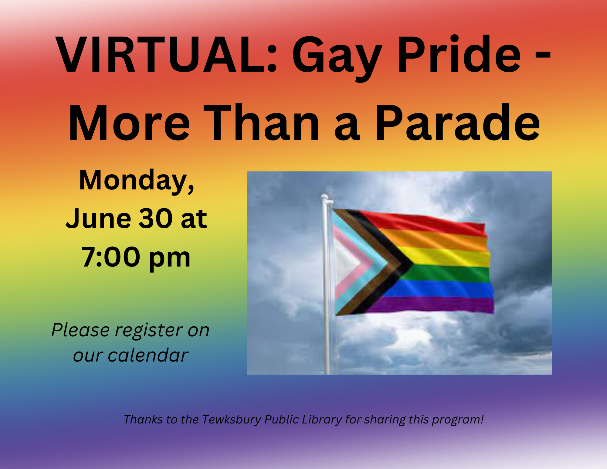 VIRTUAL: Gay Pride - More than a Parade Monday, June 30 at 7:00 pm June is Pride Month, which honors the 1969 Stonewall Uprising in Manhattan, a turning point for the Gay Liberation Movement in the United States. What started as an angry mob's violent reaction to a police raid in 1969 ignited the gay rights movement and has over time grown to become a joyous annual celebration. Explore the origins of Pride Month and why it has grown into an annual tradition observed in America and many other countries. Thanks to the Tewksbury Public Library for sharing this program!