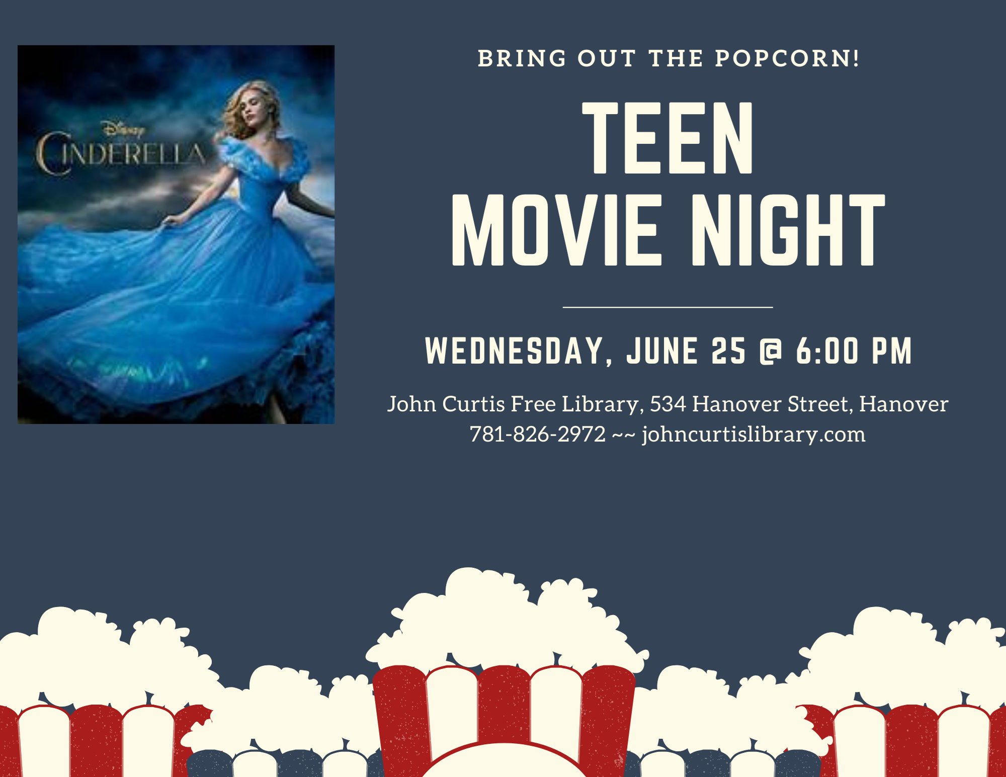 Teen Movie Night Wednesday, June 25 at 6:00 pm Join us for Teen Movie Night - June's Title: The Live-action Disney Cinderella. Snacks provided - you might even win the door prize! For July and August, we'll be shifting to a weekly series that relate to the summer reading theme, "Level Up at Your Library." Attendance at any of these movies will enter you for the Teen Summer Reading prize!