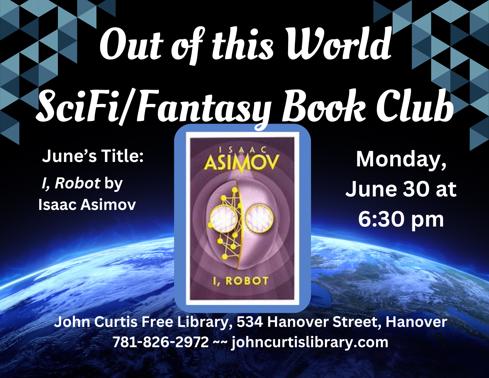IN PERSON: Out of This World Science Fiction/Fantasy Book Club Monday, June 30 at 6:30 pm Join us for the Out of This World Science Fiction / Fantasy Book Club! We meet on the last Monday of the month, and alternate between science fiction and fantasy titles. The title for June is I, Robot by Isaac Asimov We will be taking a summer break for July and August. See you in September!