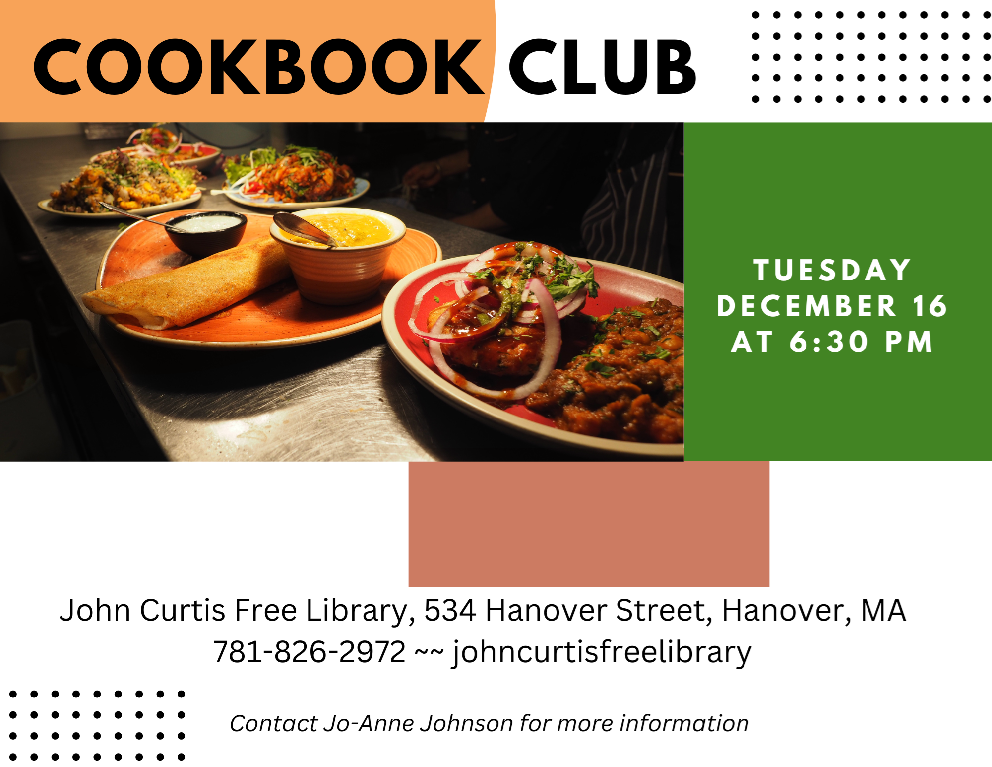 IN PERSON: Cookbook Club Tuesday, December 16 at 6:30 pm It's the famous Christmas Cookie Exchange! Try out new recipes and bring the results to share! For more information, please contact Jo-Anne Johnson at 781-826-2972, jjohnson@hanover.ocln.org