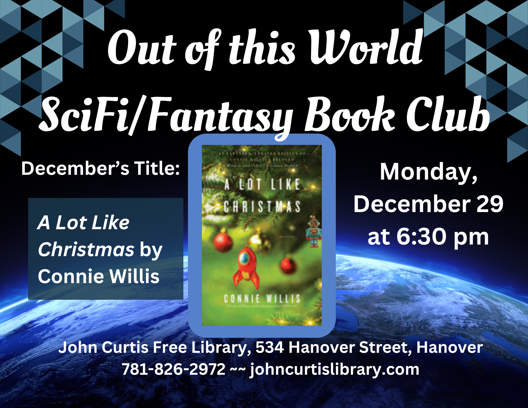 IN PERSON: Out of This World Science Fiction/Fantasy Book Club Monday, December 29 at 6:30 pm Join us for the Out of This World Science Fiction / Fantasy Book Club! We meet on the last Monday of the month, and alternate between science fiction and fantasy titles. In January, we will be moving this to a virtual platform! The title for December is A Lot Like Christmas by Connie Willis