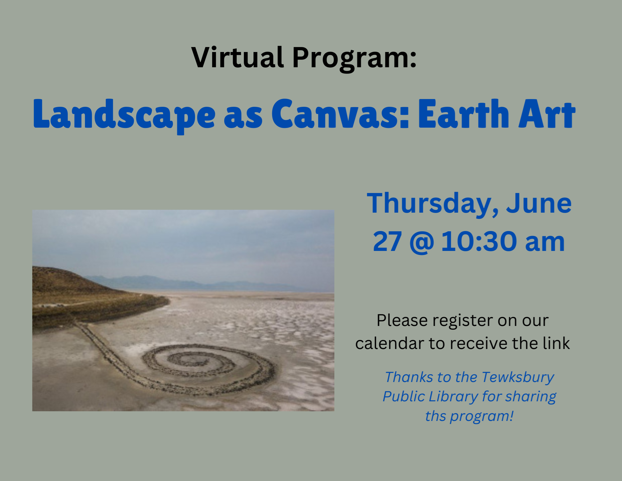 VIRTUAL: Landscape as Canvas - Earth Art Thursday, June 27 at 10:30 am In the 1960s and 70s, artists like Robert Smithson, Nancy Holt, and Ana Mendietta began the revolutionary practice of making art using materials from the natural world. Learn more about the inspiration for the movement and get insight into the works of several leading artists, including Andy Goldsworthy. Led by art historian Jane Oneail, founder of Culturally Curious, a company that curates and delivers art appreciation programs for audiences worldwide. Thanks to the Tewksbury Public Library for sharing this program!