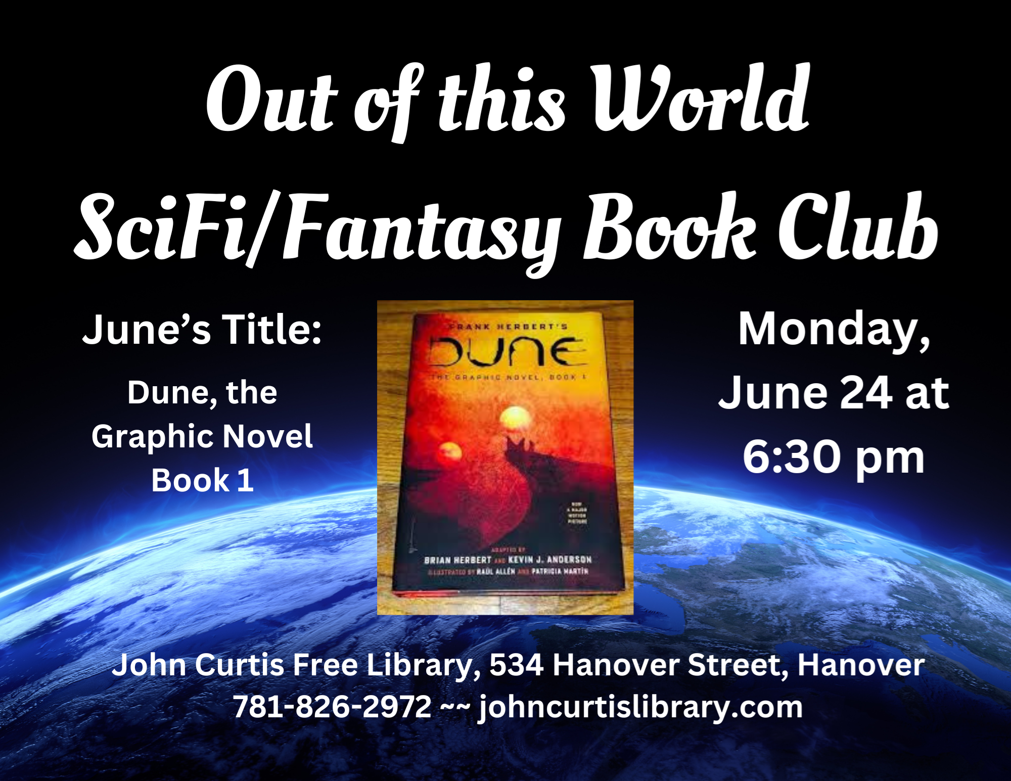 IN PERSON: Out of This World Science Fiction and Fantasy Book Club Monday, June 24 at 6:30 pm Join us for Out of This World Science Fiction/Fantasy Book Club! We meet the last Monday of the month, and alternate between science fiction and fantasy. The title for June is: Frank Herbert's Dune The Graphic Novel, Book 1 Please Note: The club will not meet during July and August.