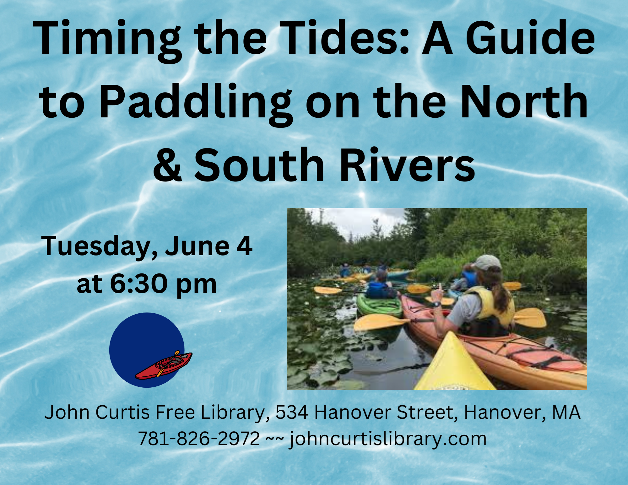 IN PERSON: Timing the Tides: A Guide to Paddling on the North and South Rivers Tuesday, June 4 at 6:30 pm Presented by the North and South Rivers Watershed Association! It's for people who enjoy kayaking, canoeing and paddle boarding and want to know how to time the tides to safely paddle at several locations on the North, South and Herring Rivers. We’ll cover where to launch and how to safely paddle in these beautiful waterways. The presentation includes practical information for paddlers of all experience levels.