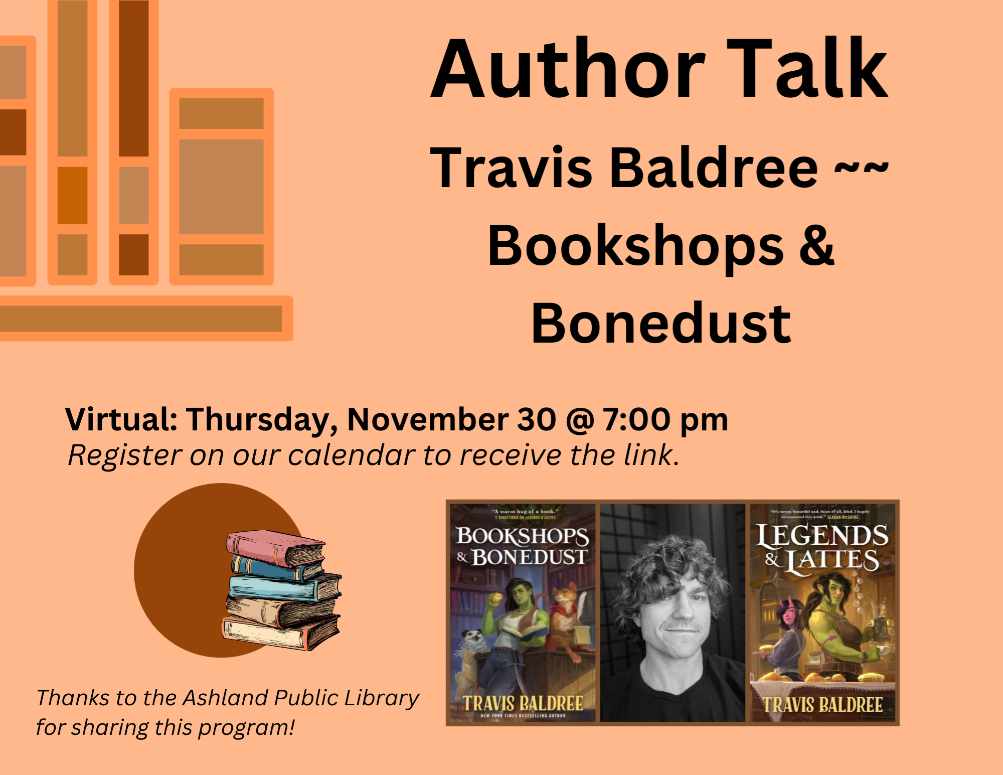 VIRTUAL: Author Talk with Travis Baldree Thursday, November 30 @ 7:00 pm Join us for a fun conversation with Travis Baldree as he discusses his journey from audiobook narrator to low stakes fantasy writer. Thanks to the Ashland Public Library for sharing this program!