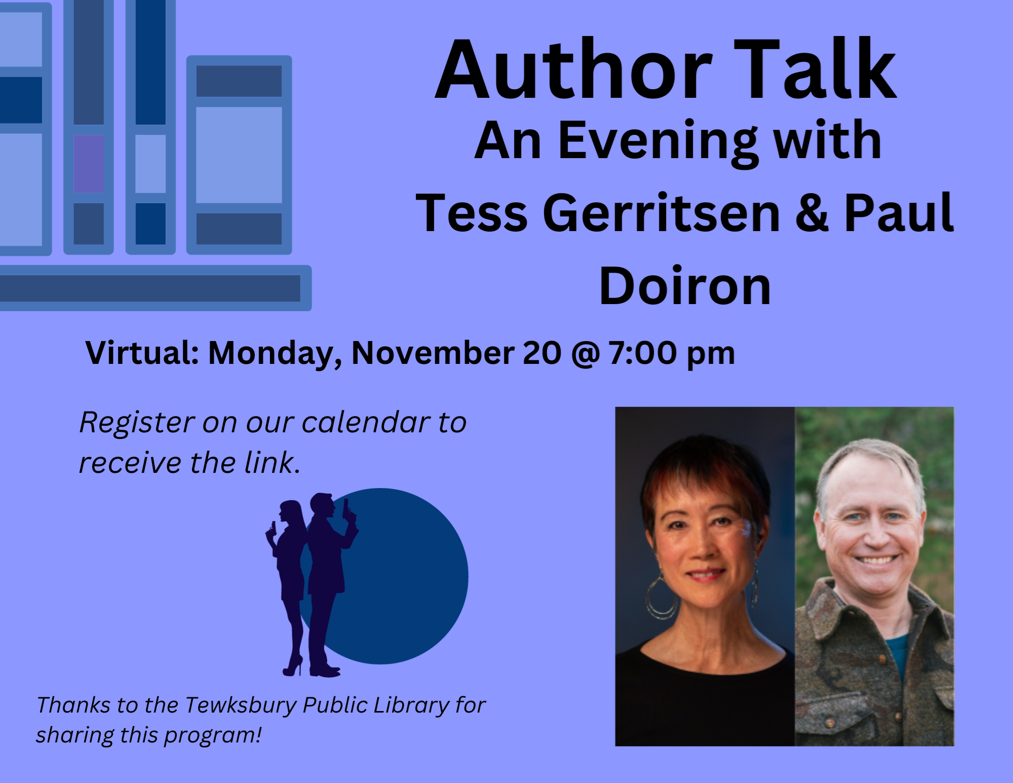 VIRTUAL: Author Talk with Tess Gerritsen and Paul Doiron Monday, November 20 @ 7:00 pm Bestselling author Tess Gerritsen will discuss her brand new book, The Spy Coast, in conversation with bestselling author Paul Doiron. A retired CIA operative in small-town Maine tackles the ghosts of her past in this fresh take on the spy thriller. Thanks to the Tewksbury Public Library for sharing this program!