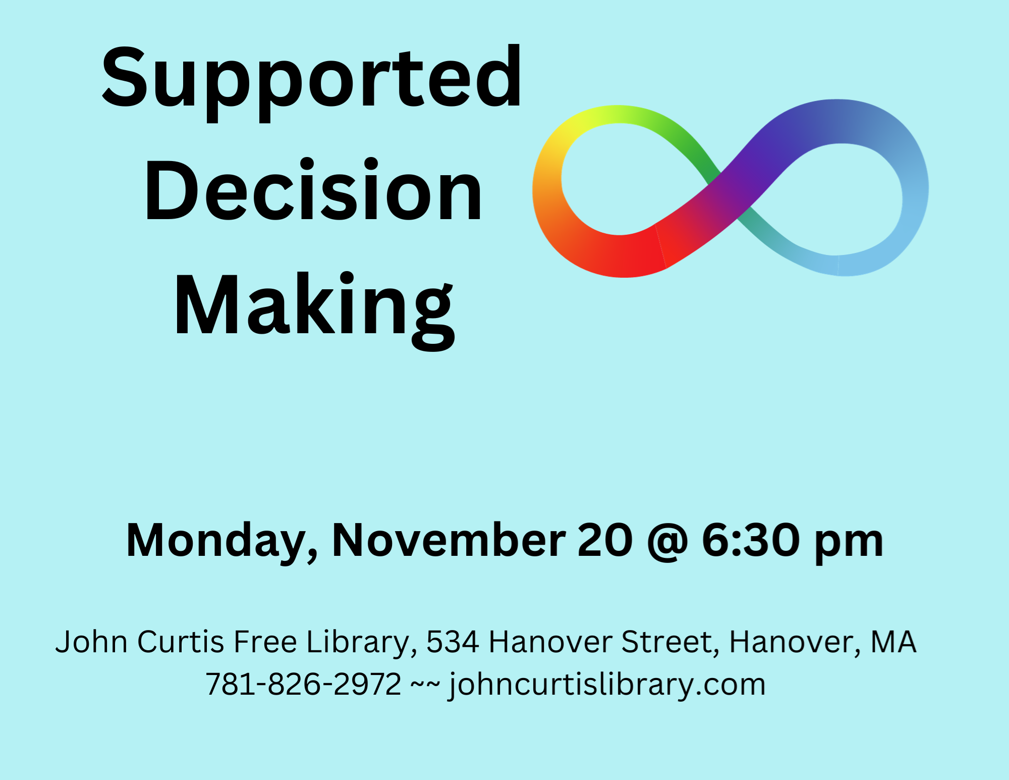 Supported Decision Making Monday, November 20 @ 6:30 pm IN PERSON! Join East Bridgewater resident Jonathan Gardner as he discusses Supported Decision Making. Jonathan is a 20-year-old self-advocate, home school graduate, cancer survivor who happens to have Autism. SDM is an alternative to guardianship.