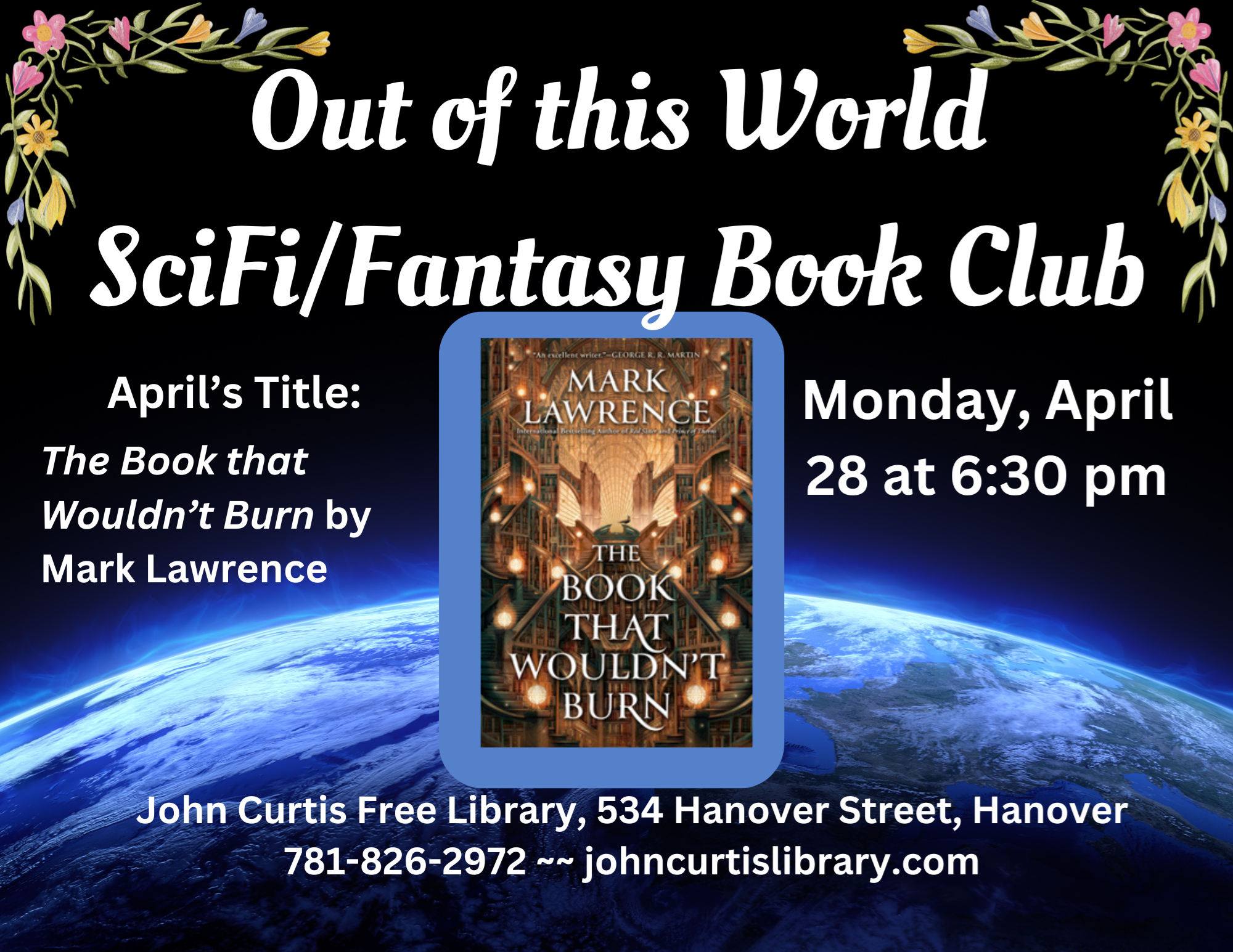 Out of This World Science Fiction/Fantasy Book Club Monday, April 28 at 6:30 pm Join us for the Out of This World Science Fiction / Fantasy Book Club! We meet on the last Monday of the month, and alternate between science fiction and fantasy titles. The title for April is The Book that Wouldn't Burn by Mark Lawrence For more information, contact Virginia Johnson at 781-826-2972, or email vjohnson@hanover.ocln.org