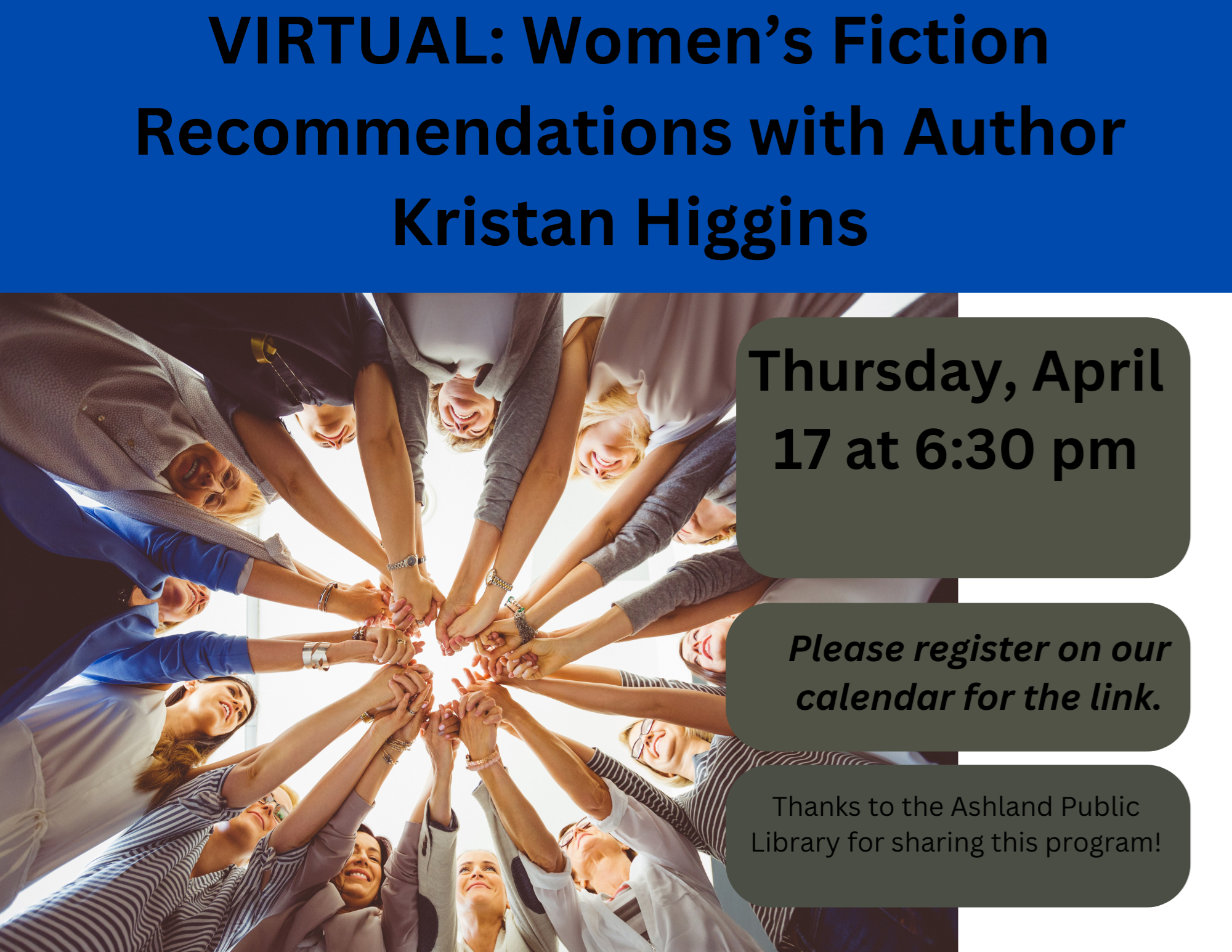 Virtual - Women's Fiction Book Recs with Bestselling Author, Kristan Higgins Thursday, April 17 at 6:30 pm Love Women's Fiction but not sure what to read next? Join bestselling author, Kristan Higgins, quarterly for 30 minutes of pure book recommendations - the best of women's fiction out there! We're sure you'll find something to like from Kristan's many enthusiastic reviews. Kristan Higgins is the New York Times, USA TODAY and Publishers Weekly bestselling author of more than twenty novels. Thanks to the Ashland Public Library for sharing this program!