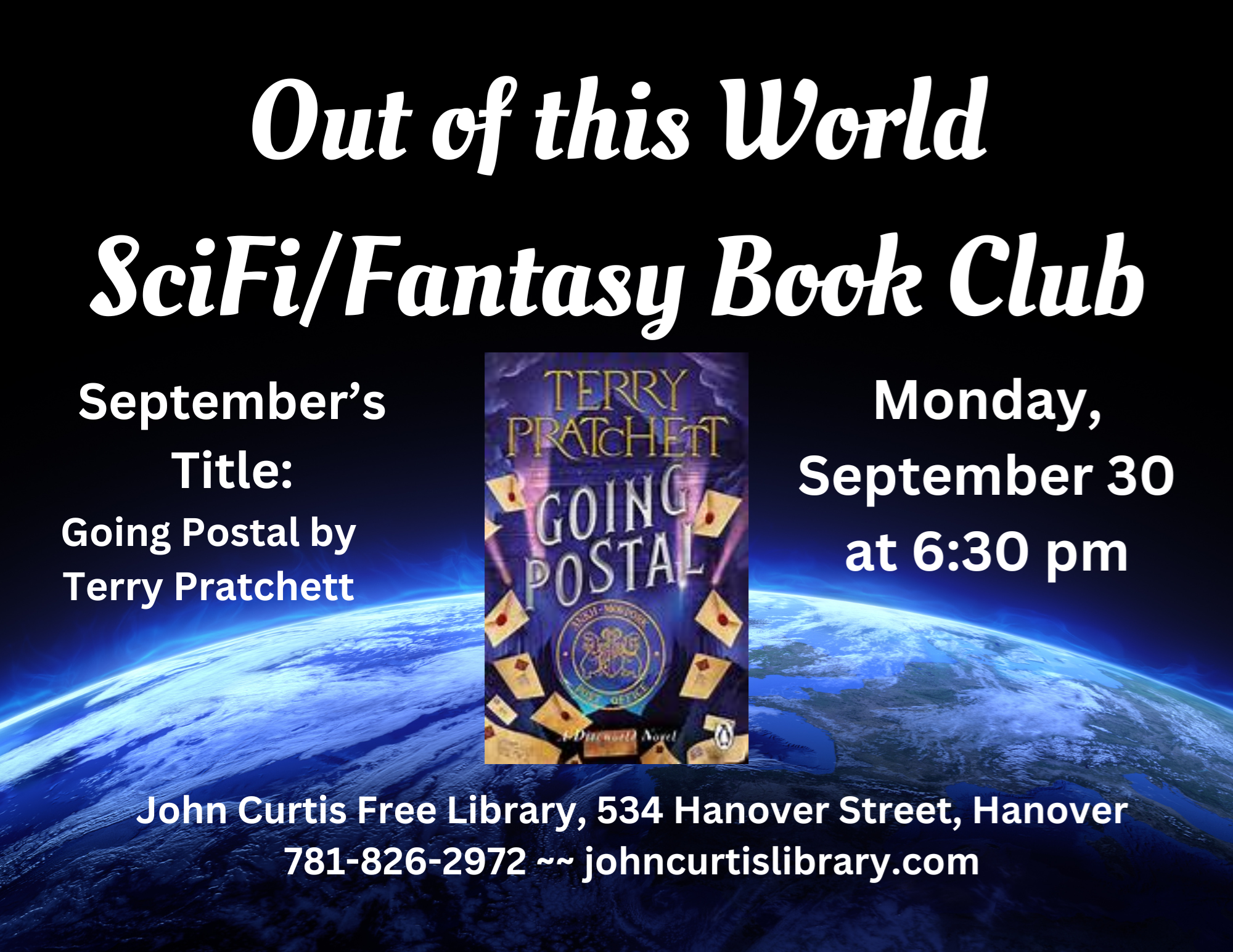Out of This World Science Fiction/Fantasy Book Club Monday, September 30 at 6:30 pm Join us for the Out of This World Science Fiction / Fantasy Book Club! We meet on the last Monday of the month, and alternate between science fiction and fantasy titles. The title for September is Going Postal by Terry Pratchett