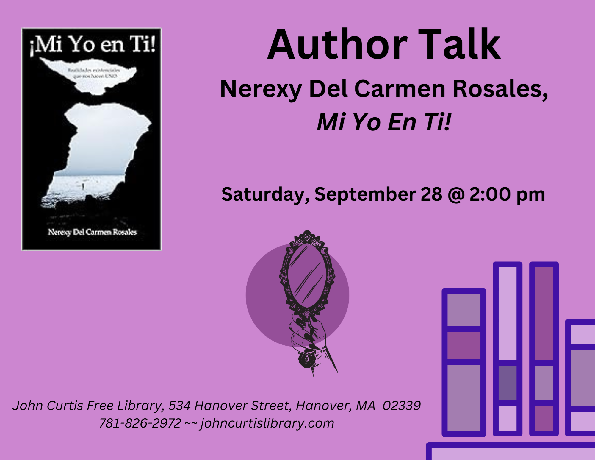 Local Author Nerexy Del Carmen Rosales, Mi Yo en Ti! Saturday, September 28 at 2:00 pm Local poet Nerexy Del Carmen Rosales will give a reading and talk about her new poetry collection, Mi Yo en Ti!