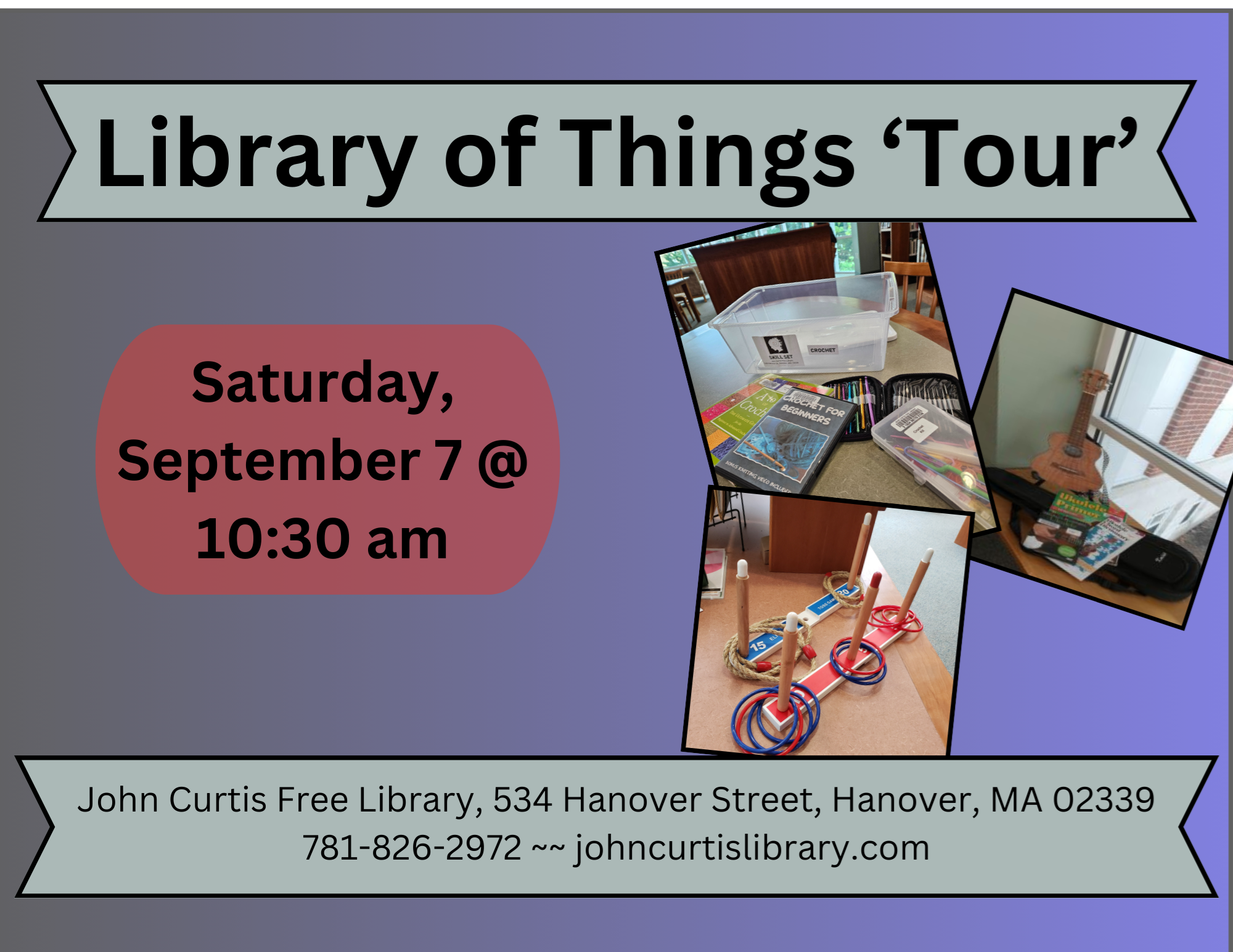 Library of Things 'Tour' Saturday, September 7 from 10:30-noon Did you know that we have a 'Library of Things?' We have games, how-tos, devices, you name it! Everything from an ASL (American Sign Language) kit to a Ukulele - and lots in between - that you can check out! Come and take a hands-on tour of our Library of Things in our large meeting room!!