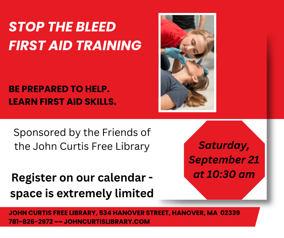Friends of the John Curtis Free Library Presents... CPR & Stop the Bleed Program Saturday, September 21 at 10:30 am Ever wanted to learn CPR? Join HFD member, Eric Johnson, as he takes us through basic CPR and the "Stop the Bleed" first aid program. Please register on our calendar, as space is extremely limited. This program is sponsored by the Friends of the John Curtis Free Library. Join the Friends today!