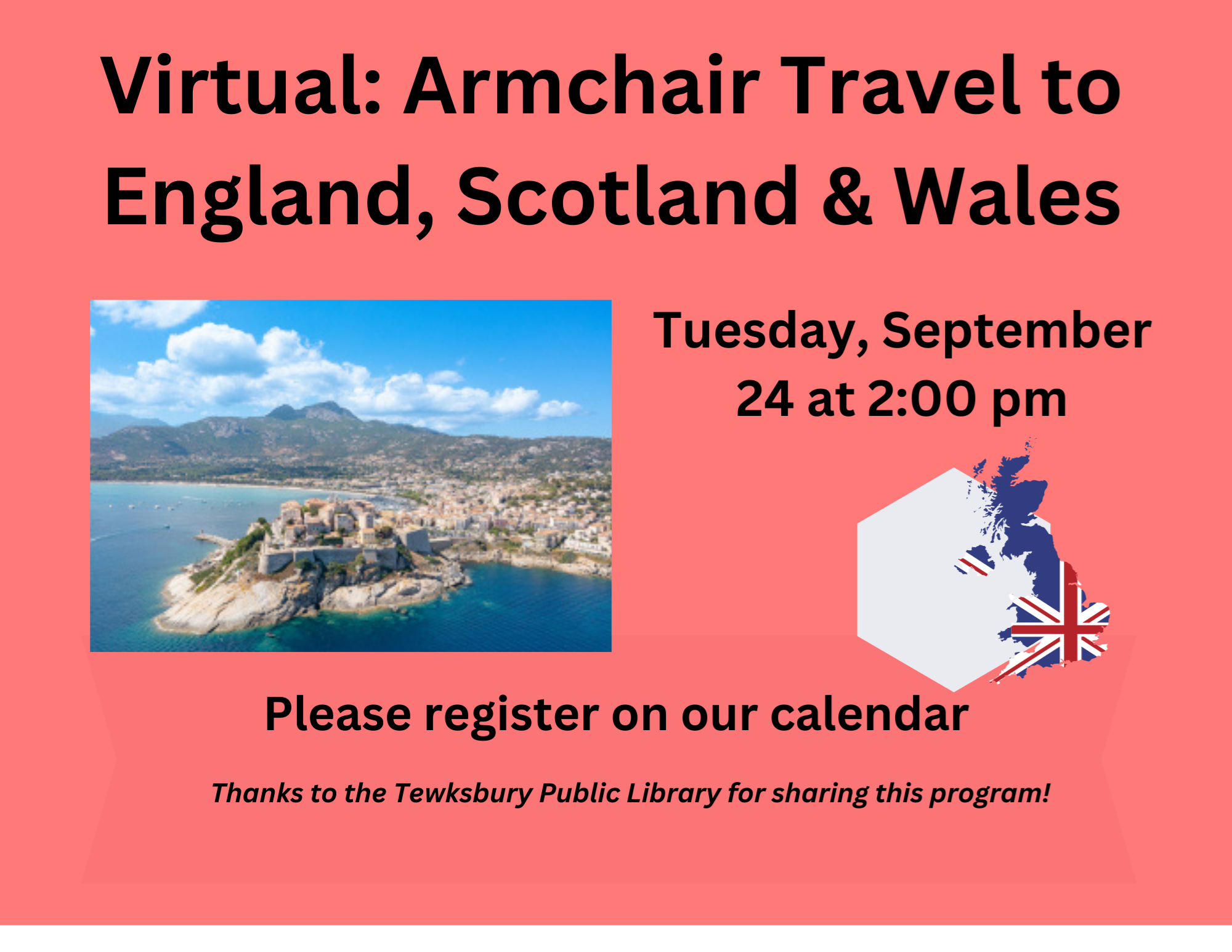 VIRTUAL: Armchair Travel to England, Scotland & Wales Tuesday, September 24 at 2:00 pm Travel to the amazing areas of Great Britain outside London. Explore major cities like Liverpool and Edinburgh as well as rural villages where the past and present coexist. Examine Britain's transition from global empire to modern reality. Led by Gene Flynn, an Illinois native, who has taught at the College of Lake County and Harper College, and serves on the board of the Institute for Continued Learning at Roosevelt University. He frequently gives travel presentations to libraries and senior centers around the country. Thanks to the Tewksbury Public Library for sharing this program!