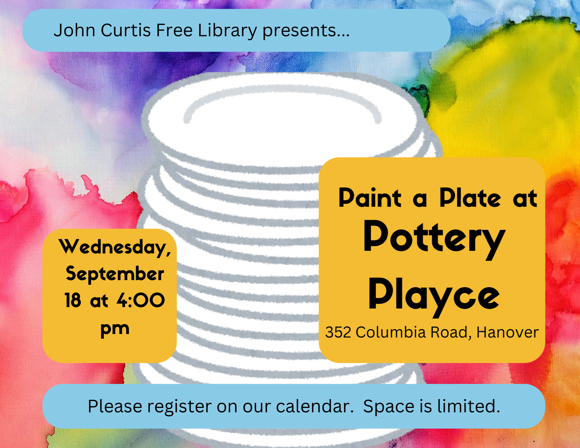 AT POTTERY PLAYCE - Paint a Plate Wednesday, September 18 at 4:00 pm SPECIAL NOTE: THIS PROGRAM TAKES PLACE AT THE POTTERY PLAYCE, 352 Columbia Road, Hanover, MA 02339 Join us for another off-site program - this time held at the Pottery Playce! Join us and paint a plate! Thanks to Pottery Playce for hosting!