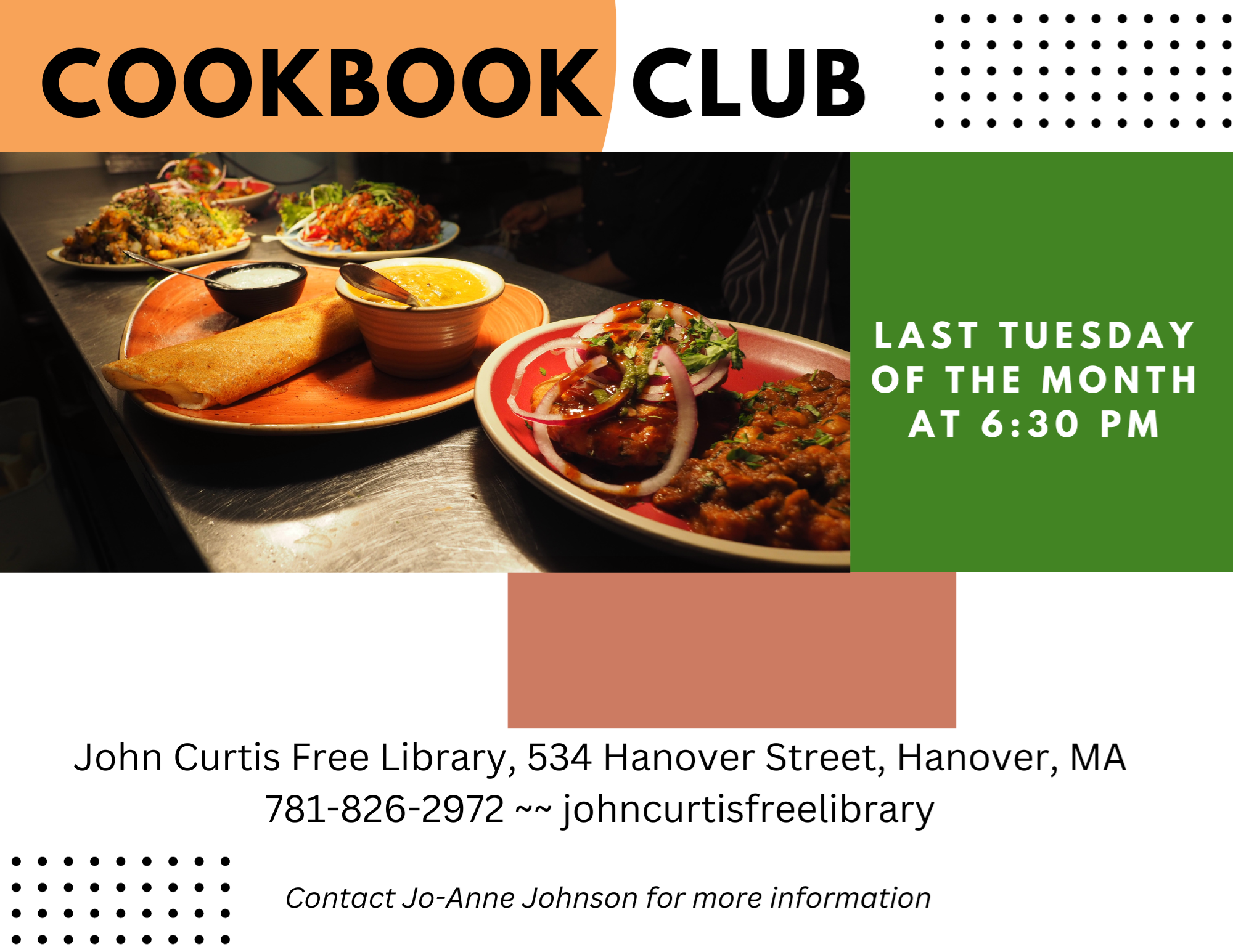 Cookbook Club Tuesday, September 24 at 6:30 pm Cookbook Club meets on the last Tuesday of the month! Try out new recipes and bring the results to share!